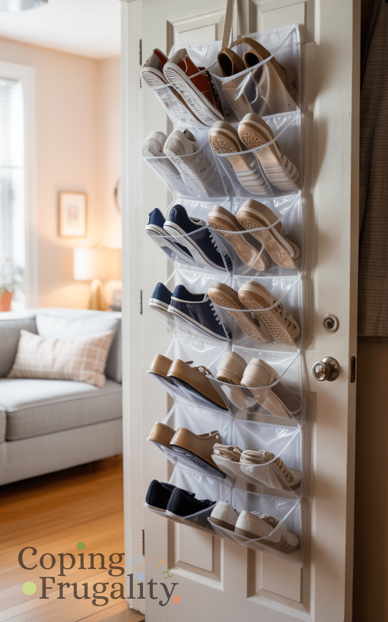 Over-the-door organizers are classic entryway shoe storage ideas on a budget that maximize vertical space. They’re inexpensive, easy to install, and perfect for keeping shoes visible yet organized. Clear pockets make it easy to see every pair at a glance. This solution works especially well in apartments where floor space is limited and drilling isn’t allowed.