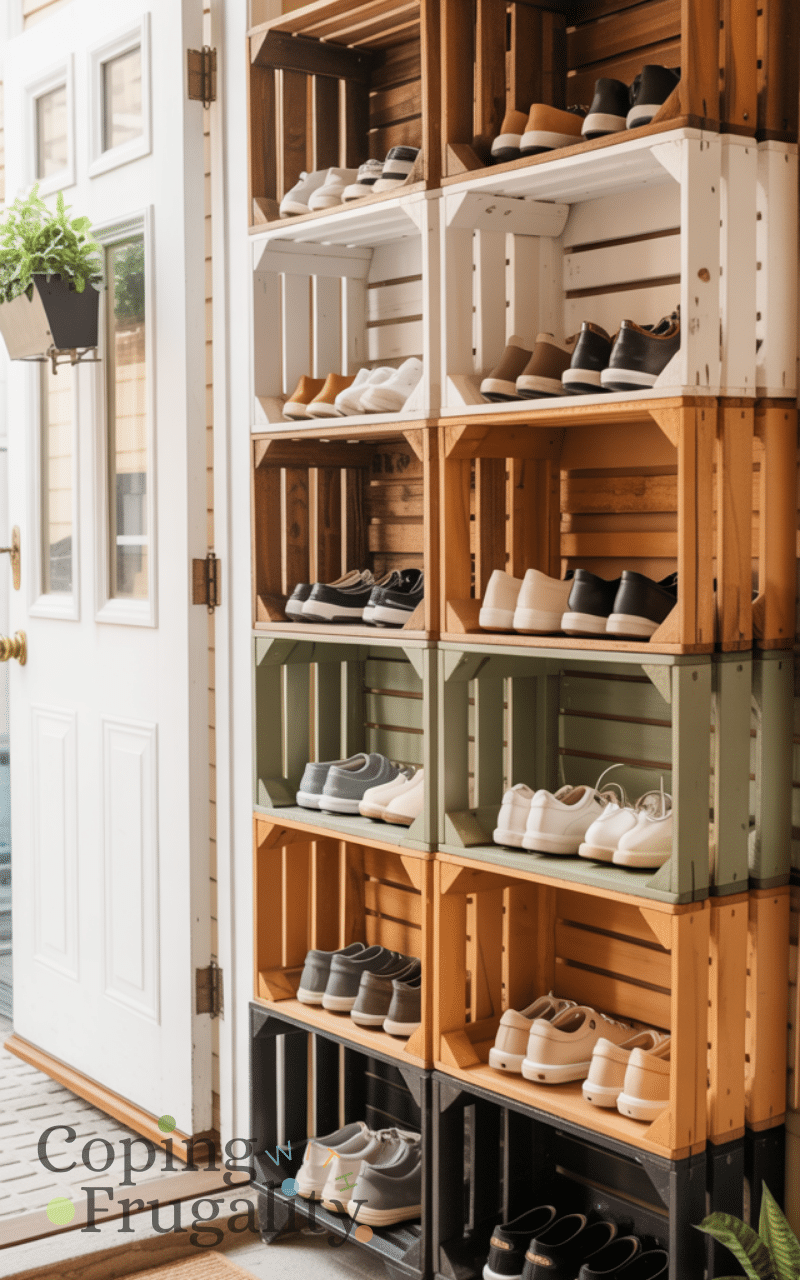 Using wooden crates is a creative way to achieve entryway shoe storage ideas on a budget with personality. You can stack or mount crates vertically to create cubbies for shoes. They’re often inexpensive and easy to find at markets or second-hand stores. Sand and paint them for a polished look or leave them natural for rustic charm. This idea combines storage and décor while keeping spending low.