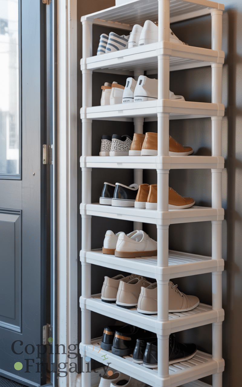 Stackable shelves are perfect entryway shoe storage ideas on a budget for growing households. You can start with one unit and add more as needed, keeping costs under control. These shelves are lightweight, easy to clean, and ideal for small entryways. Their modular design lets you customize height and width based on your space. This flexibility makes them a smart solution for renters who want affordable storage without permanent changes.