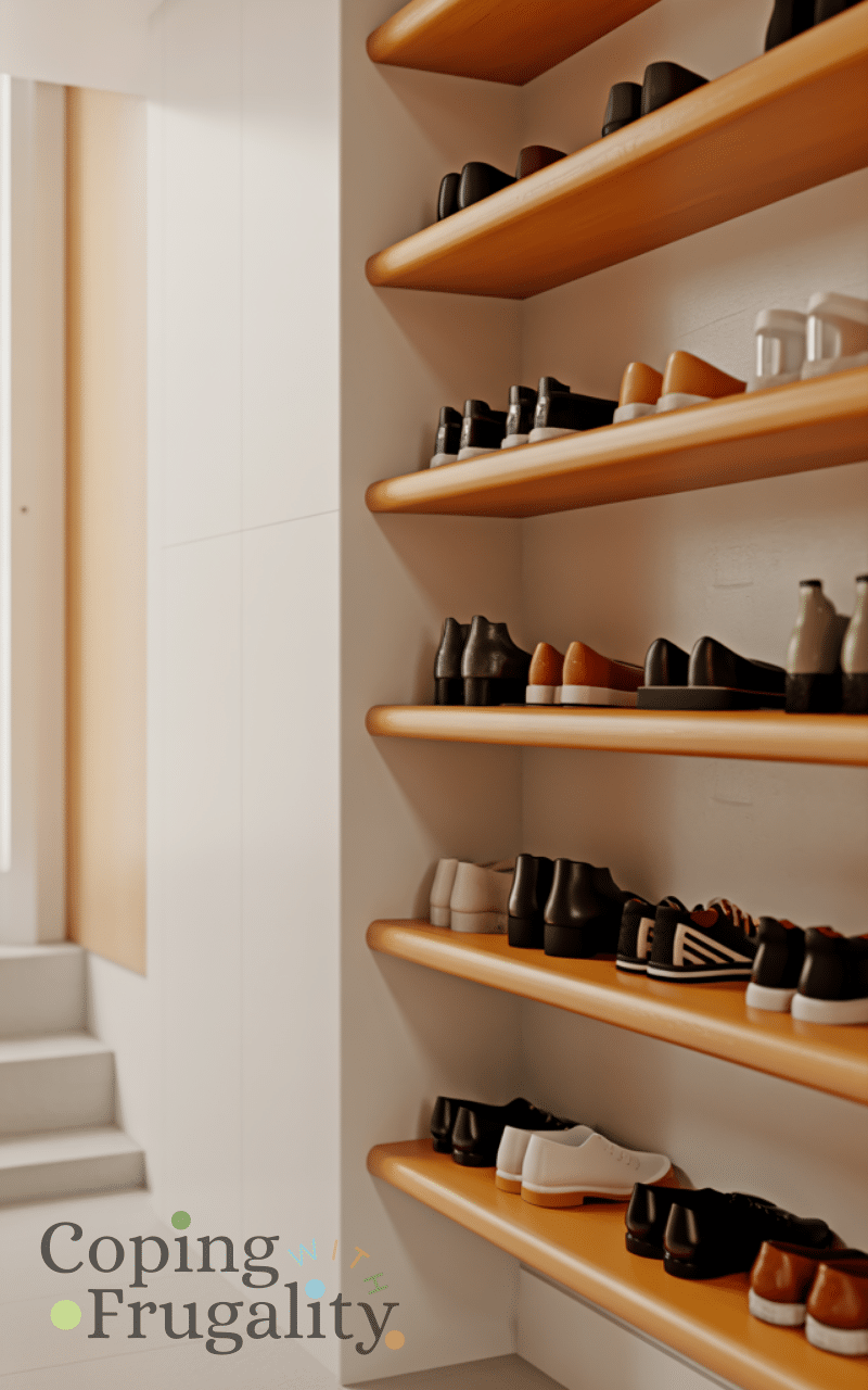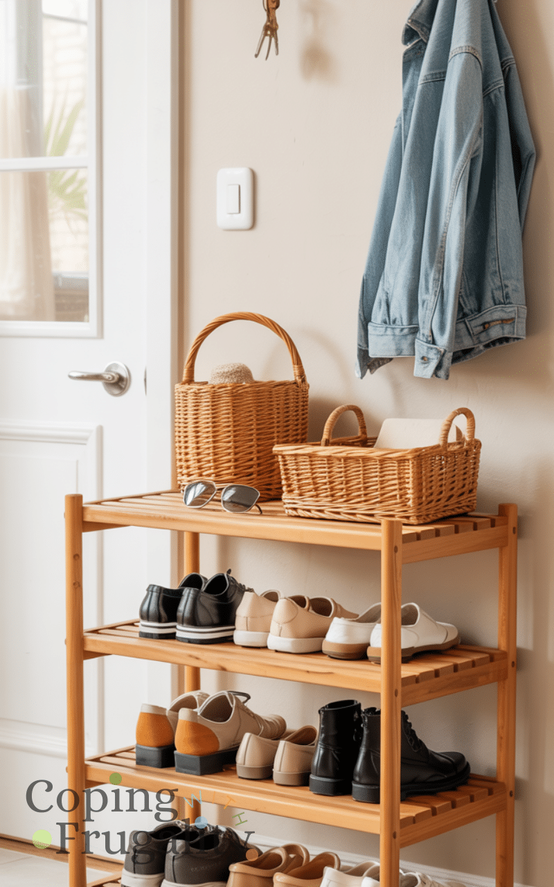 An open shoe rack is one of the easiest entryway shoe storage ideas on a budget because it’s affordable, accessible, and easy to style. You can find metal or wooden racks at low cost, and they instantly keep shoes off the floor. Open racks make it easy to grab shoes on busy mornings and encourage family members to stay organized. Add small baskets on top for keys or accessories, and you’ve created a functional entryway zone without investing in custom furniture.