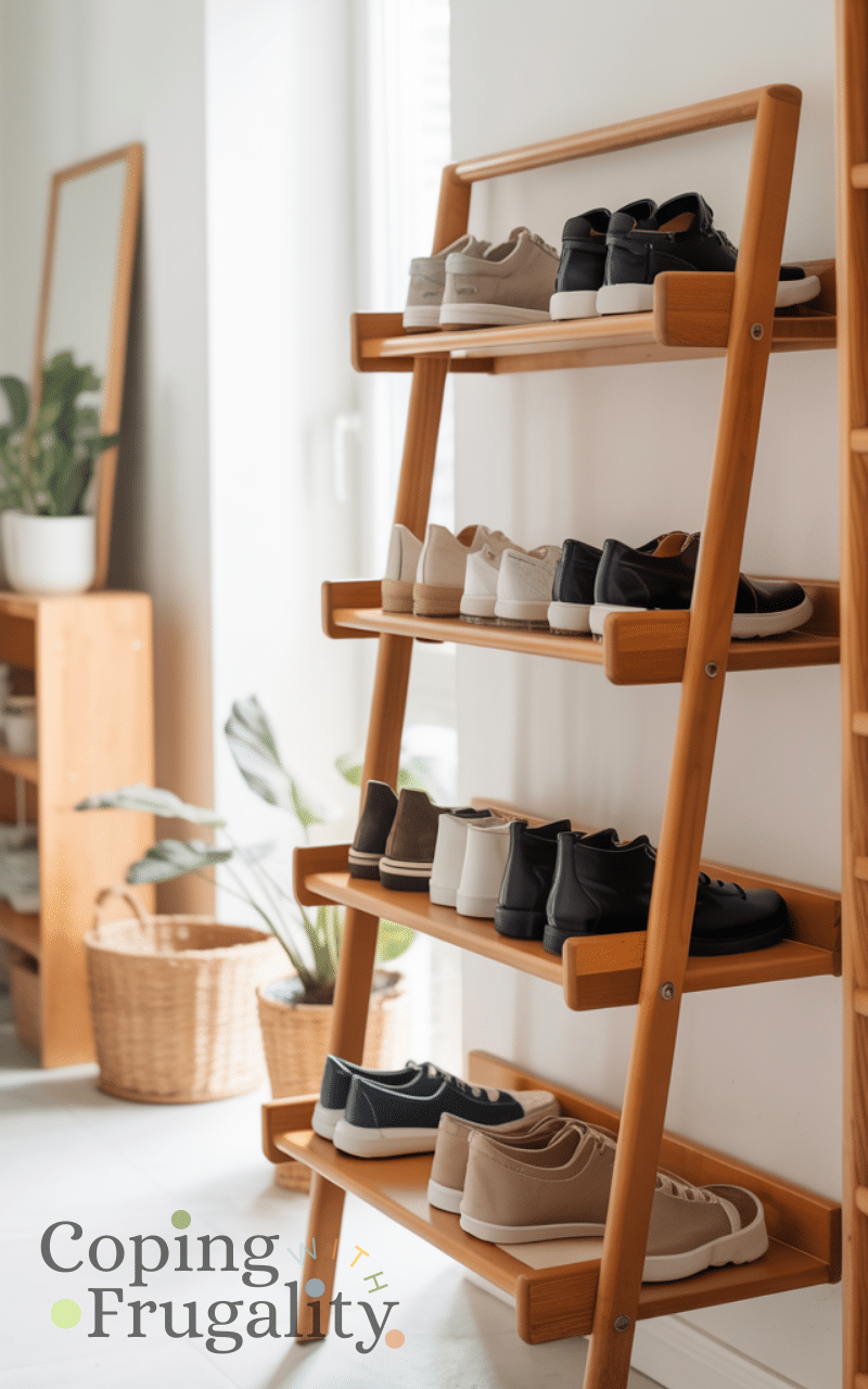 A ladder shelf is a stylish take on entryway shoe storage ideas on a budget. Its vertical design saves floor space while providing multiple levels for shoes. Ladder shelves are often affordable and visually light, making the entryway feel more open. This option blends storage and décor beautifully without overwhelming the space.