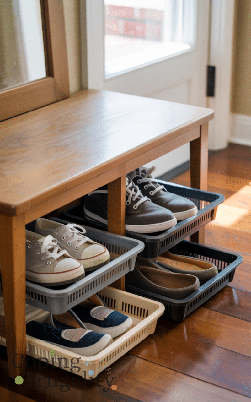 Shoe trays under a bench are practical entryway shoe storage ideas on a budget, especially in rainy or dusty areas. Trays keep dirt contained and protect your floors. This setup encourages family members to store shoes properly while maintaining cleanliness. Trays are inexpensive and easy to replace, making them a smart long-term solution.