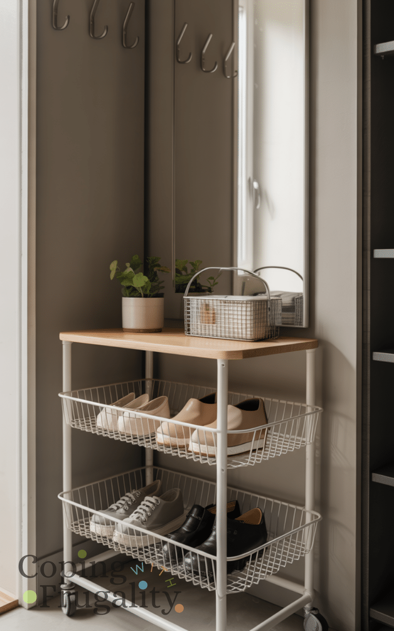 A rolling cart offers flexible entryway shoe storage ideas on a budget for small spaces. You can tuck it away when not in use and roll it out when needed. These carts are affordable and easy to move, making them great for apartments. Each tier can hold several pairs of shoes while keeping everything organized and accessible.