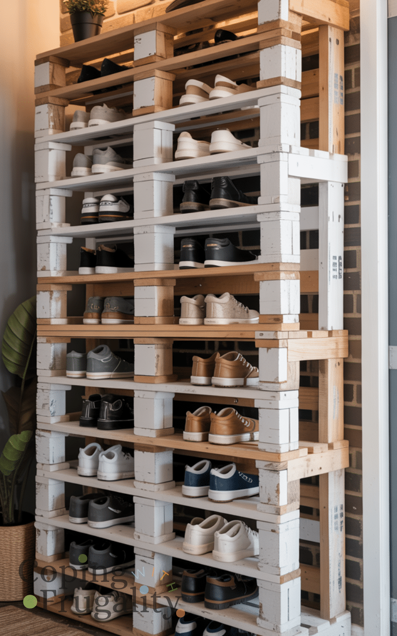 A pallet shoe rack is a creative DIY option among entryway shoe storage ideas on a budget. Pallets are often free or very cheap, making them perfect for low-cost projects. With a bit of sanding and paint, you can turn a pallet into vertical shoe storage that looks trendy and functional. It’s ideal for casual or industrial-style homes.