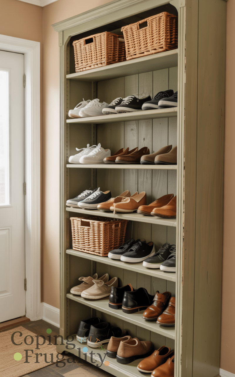 An old bookshelf can become clever entryway shoe storage ideas on a budget with minimal effort. Adjust shelf heights to fit shoes, or add baskets for a cleaner look. Repurposing furniture saves money and adds character to your entryway. With a fresh coat of paint, a second-hand bookshelf can look custom-made for your space.