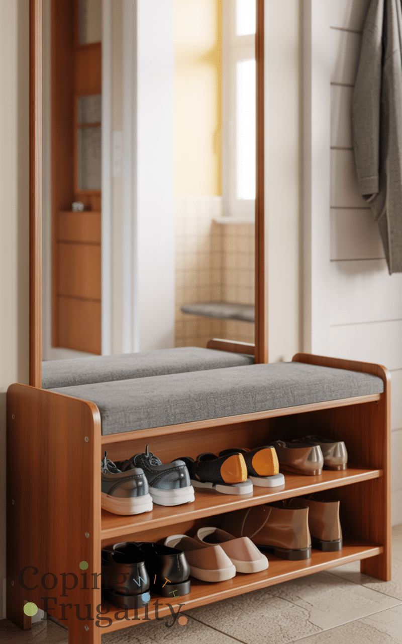 A shoe bench combines seating and storage, making it one of the most functional entryway shoe storage ideas on a budget. You can sit comfortably while putting on shoes, while the space underneath stores footwear neatly. Many budget-friendly benches include shelves or cubbies. This dual-purpose furniture piece adds comfort and organization without the cost of multiple items.