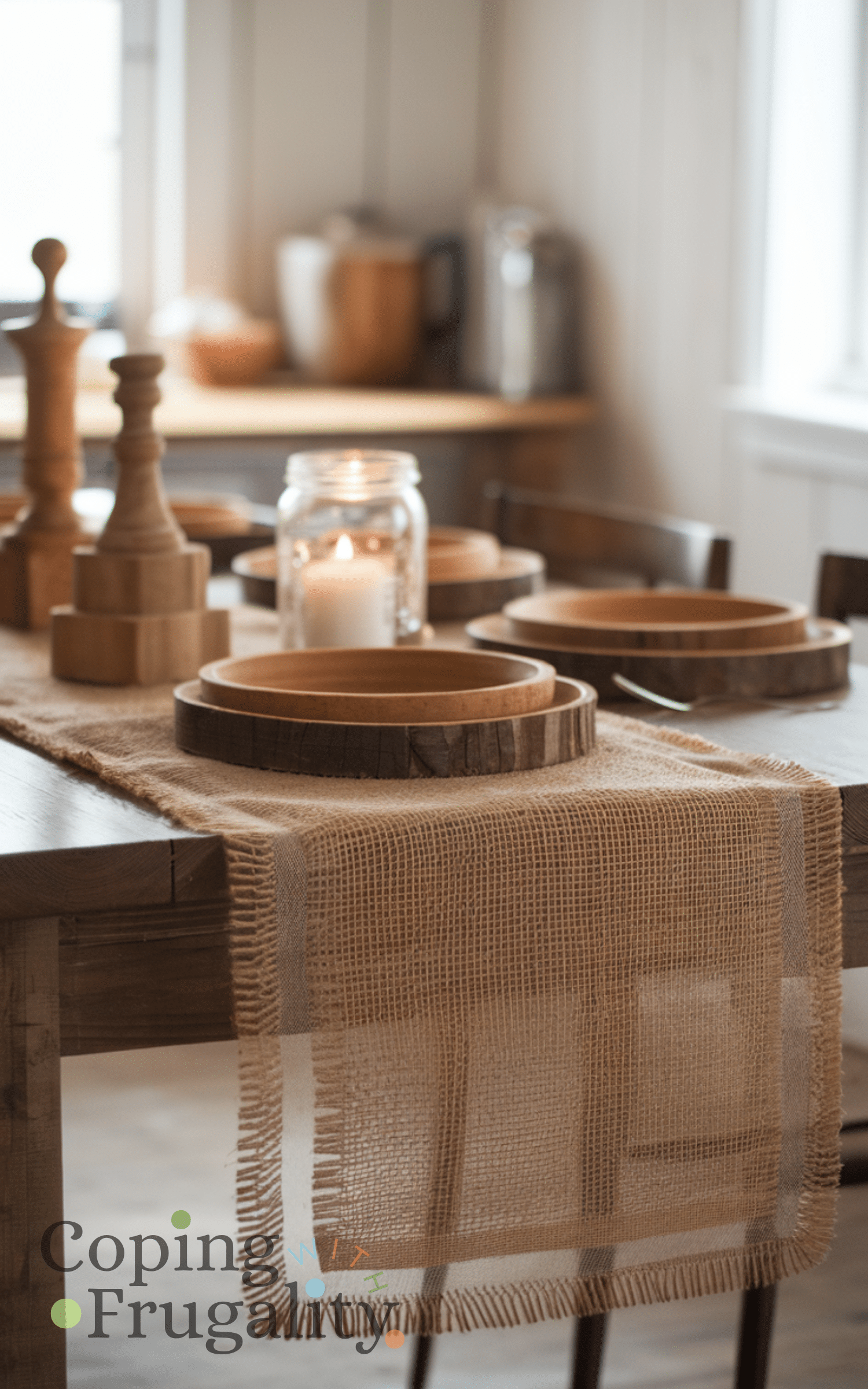 A burlap table runner is one of the simplest farmhouse decor ideas on a budget because it adds texture and warmth to your dining table You can cut a strip of burlap fabric and place it over your table for an instant rustic look that feels inviting This decor works beautifully for everyday use or special occasions and you can pair it with wooden plates or mason jars for a full farmhouse look Burlap is affordable and easy to find which makes this idea perfect for decorating without overspending This farmhouse decor idea on a budget brings country charm to your home in minutes.