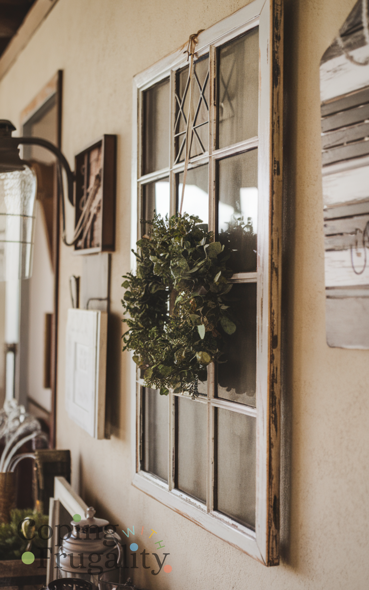 Vintage window frames are another wonderful farmhouse decor idea on a budget because they bring that rustic and nostalgic charm to your walls You can hang them as they are or use them as picture frames or even turn them into wall art by adding wreaths or string lights This DIY project is easy and affordable since you can often find old frames at thrift stores or flea markets Their distressed look gives your space an authentic farmhouse vibe that feels cozy and stylish This farmhouse decor idea on a budget proves that simple repurposed items can make your home feel warm and welcoming.