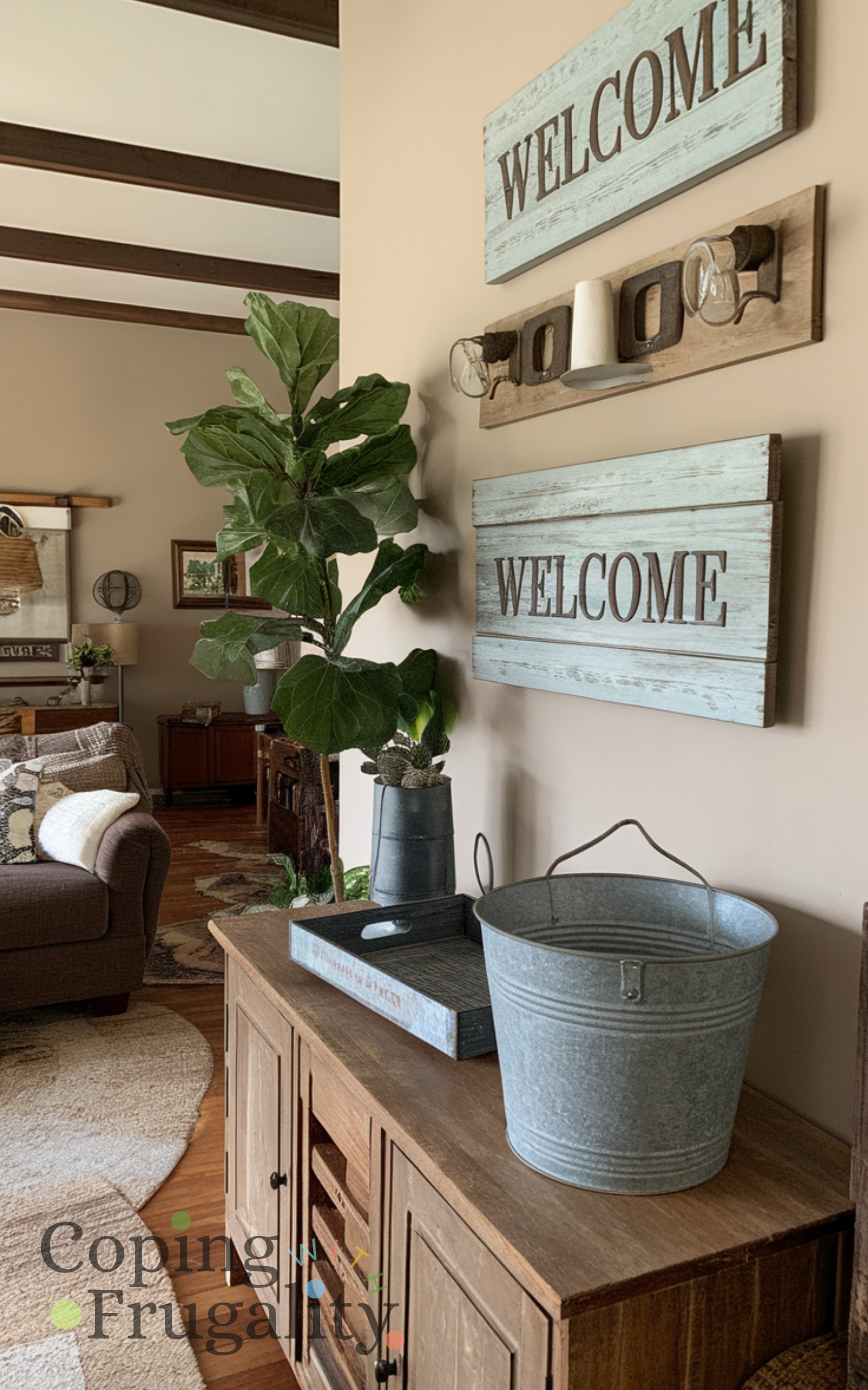Galvanized metal accents are one of the trendiest farmhouse decor ideas on a budget because they bring industrial yet rustic charm to your home You can use metal buckets trays or wall signs to decorate your kitchen or living room Their vintage look fits perfectly with wood tones and soft fabrics and creates that balanced farmhouse aesthetic that feels cozy and stylish This farmhouse decor idea on a budget adds texture and personality without a big investment.