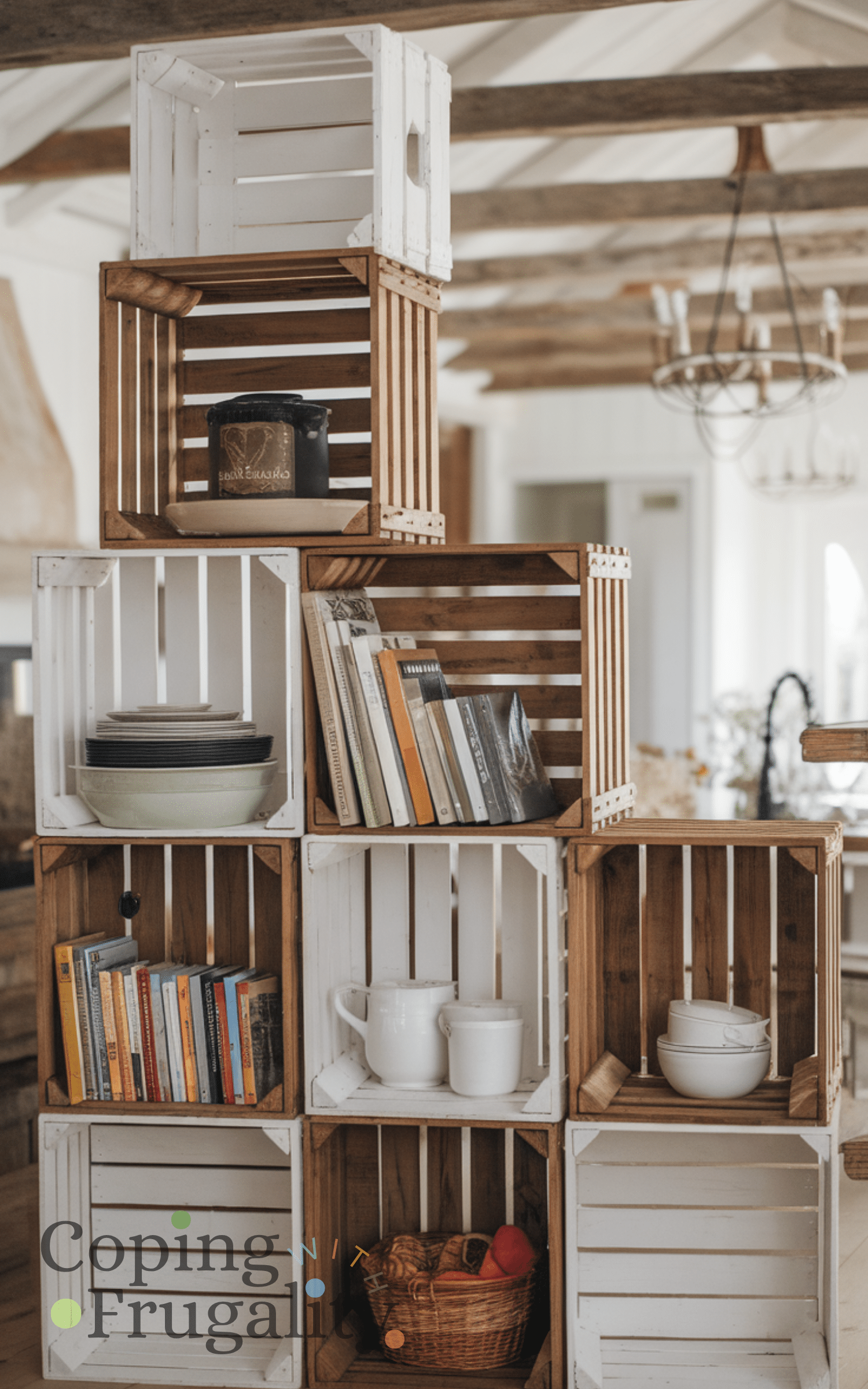 Wooden crate storage is one of the most practical farmhouse decor ideas on a budget because it helps you stay organized while adding rustic flair You can use old wooden crates to store blankets books or kitchen items and stack them for extra space Painting or staining them to match your interior creates a beautiful farmhouse look This idea is both decorative and useful since it combines style with function in a natural way Wooden crates give your home that authentic country feeling that makes farmhouse design so popular.