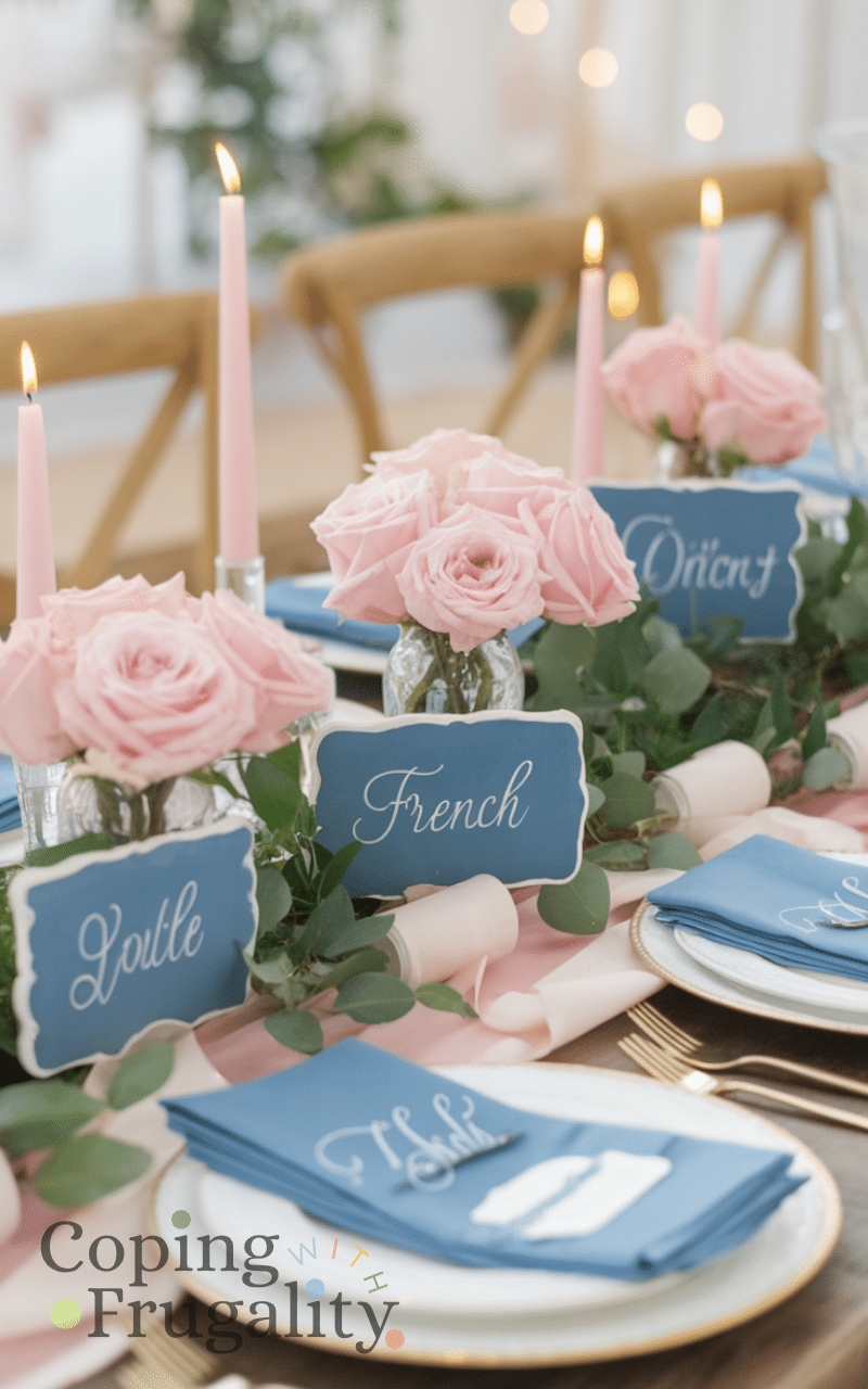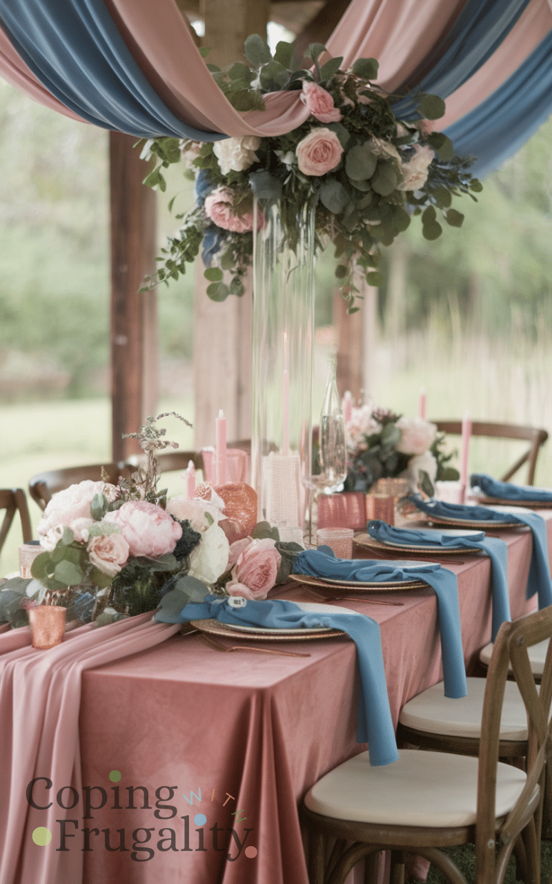 French blue and blush pink make an adorable and balanced theme and they remain one of the most romantic French Blue Wedding Color Palettes on a Budget because blush flowers are affordable and easy to find in both real and faux versions and you can mix French blue napkins signs and table details to bring softness and harmony to the décor while staying within budget and this palette suits spring and summer weddings beautifully and it also works well for intimate indoor celebrations and you can use blush ribbons French blue candles and simple greenery to create a dreamy setting that feels gentle and timeless and if you want French Blue Wedding Color Palettes on a Budget that feel sweet and elegant this combination is a perfect match.