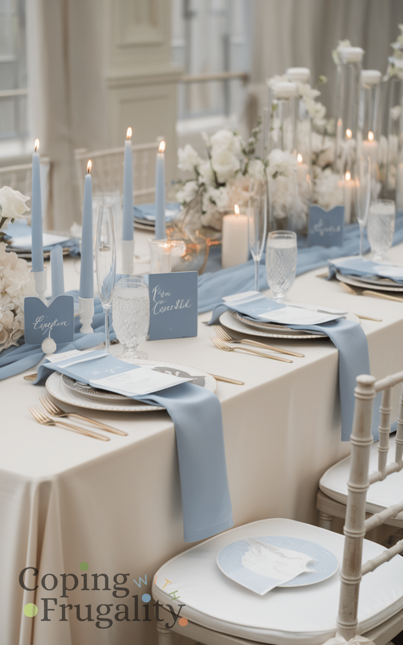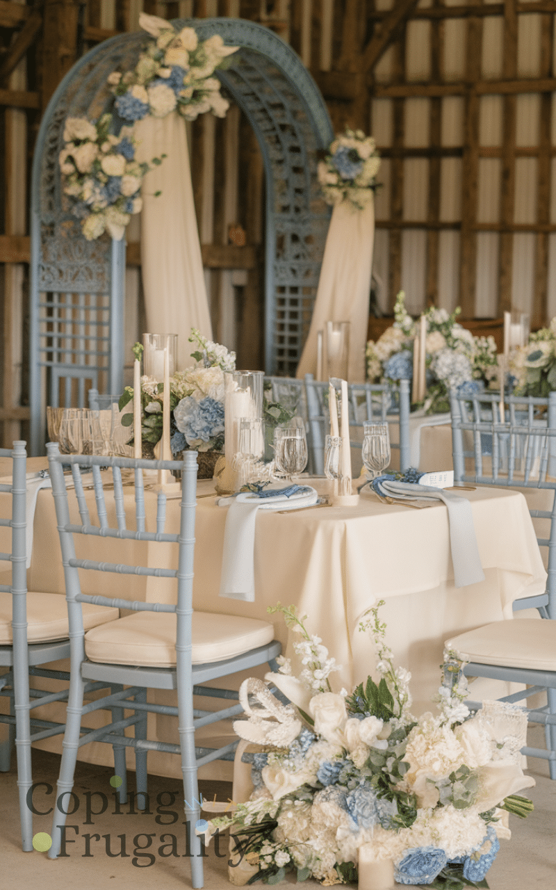 French blue and cream form a soft and sophisticated combination and they remain one of the easiest French Blue Wedding Color Palettes on a Budget because you can use inexpensive cream linens faux florals and French blue accents to create a graceful atmosphere without high costs and this palette is perfect for elegant indoor weddings rustic barns and outdoor celebrations where the neutral tones blend beautifully with the surroundings and cream helps soften the cool French blue which creates a balanced and peaceful mood and you can include cream candles French blue signage and soft bouquets for a cohesive theme and if you want French Blue Wedding Color Palettes on a Budget that are gentle and timeless this option fits beautifully.