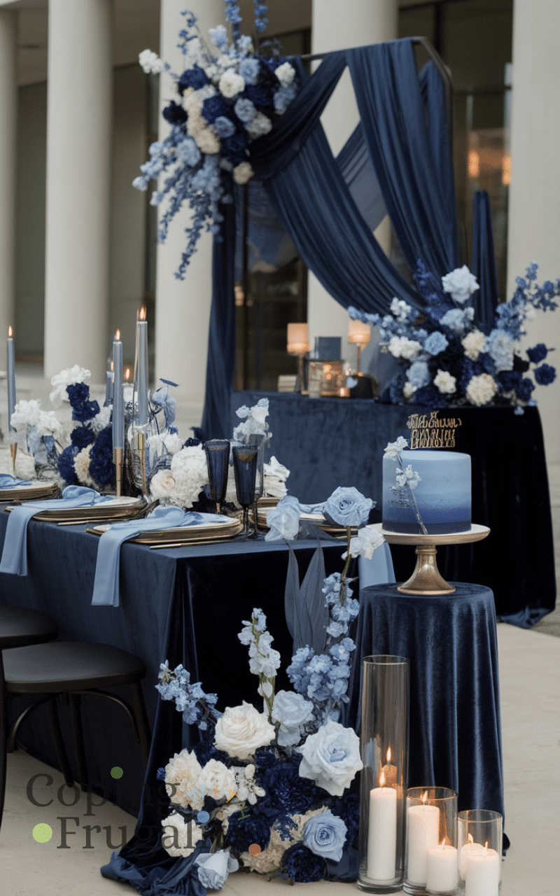 French blue and navy blue create a monochromatic look that feels rich and modern and they are one of the most stylish French Blue Wedding Color Palettes on a Budget because the two tones blend naturally without requiring expensive decorations and you can use dark navy linens paired with French blue florals ribbons and candles for a layered and elegant result and this palette suits evening weddings modern venues and beach celebrations where deep colors look especially striking and because both shades belong to the same family you can mix affordable fabrics and décor pieces without worrying about mismatched tones and if you want French Blue Wedding Color Palettes on a Budget that look elegant and bold this combination is a perfect choice.