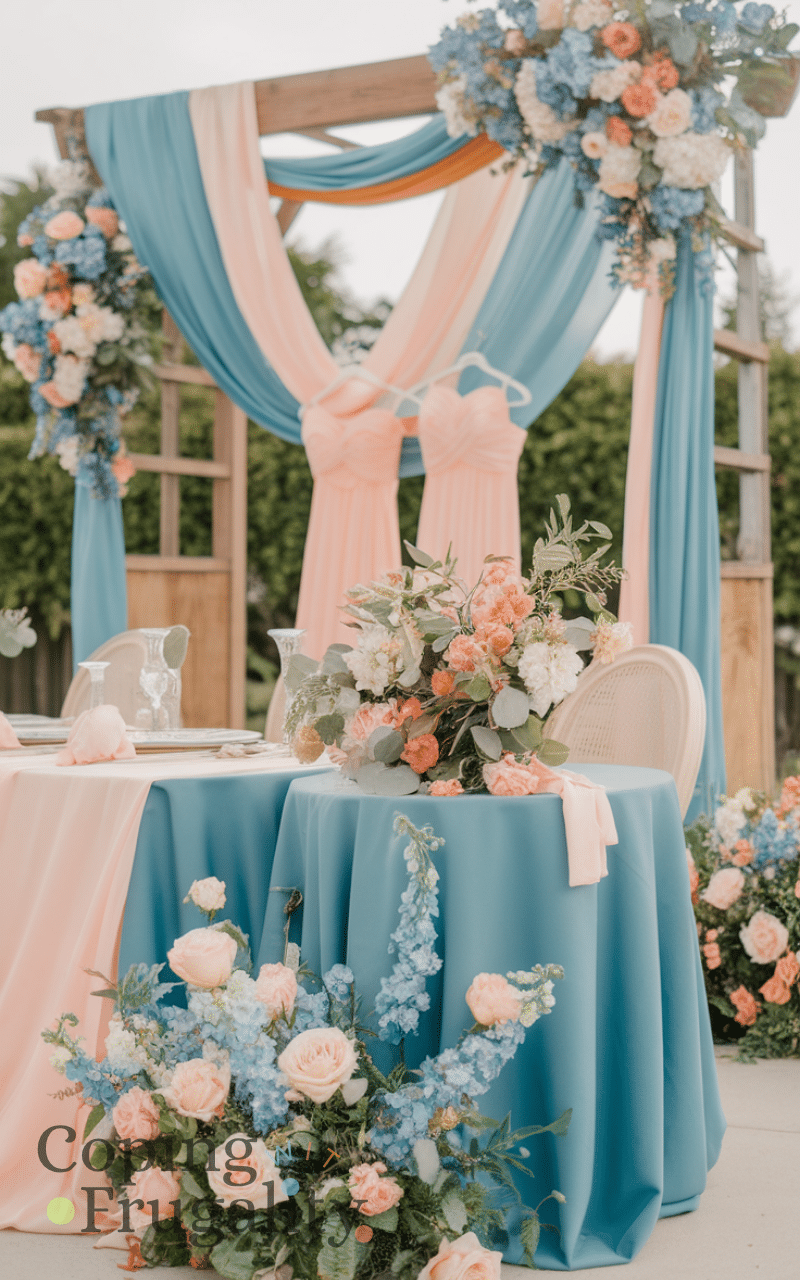 French blue and peach create a cheerful and romantic theme and they stand out as one of the most refreshing French Blue Wedding Color Palettes on a Budget because peach flowers are easy to source and affordable and this palette brings softness and sunshine to your wedding décor while keeping everything light and joyful and you can mix French blue tablecloths peach bridesmaid dresses and soft floral arrangements for a harmonious look that feels sweet and elegant and this color pairing works well for spring and summer weddings and it adds a bright charm to any venue and if you want French Blue Wedding Color Palettes on a Budget that feel fresh vibrant and romantic this choice will brighten your celebration.