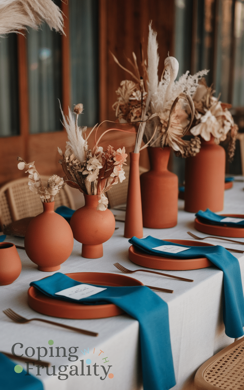 Combining French blue with terracotta creates a warm and modern look and it is one of the most unique French Blue Wedding Color Palettes on a Budget because terracotta décor pieces like pots vases and plates are inexpensive and easy to find and they add earthy charm to your celebration while blending beautifully with the cool tone of French blue and you can decorate with dried flowers terracotta holders and French blue linens to create a warm rustic and stylish setting and this palette works perfectly for fall weddings outdoor events and boho themes where natural textures shine and if you want French Blue Wedding Color Palettes on a Budget that feel trendy and warm this combination will bring character and beauty to your day.