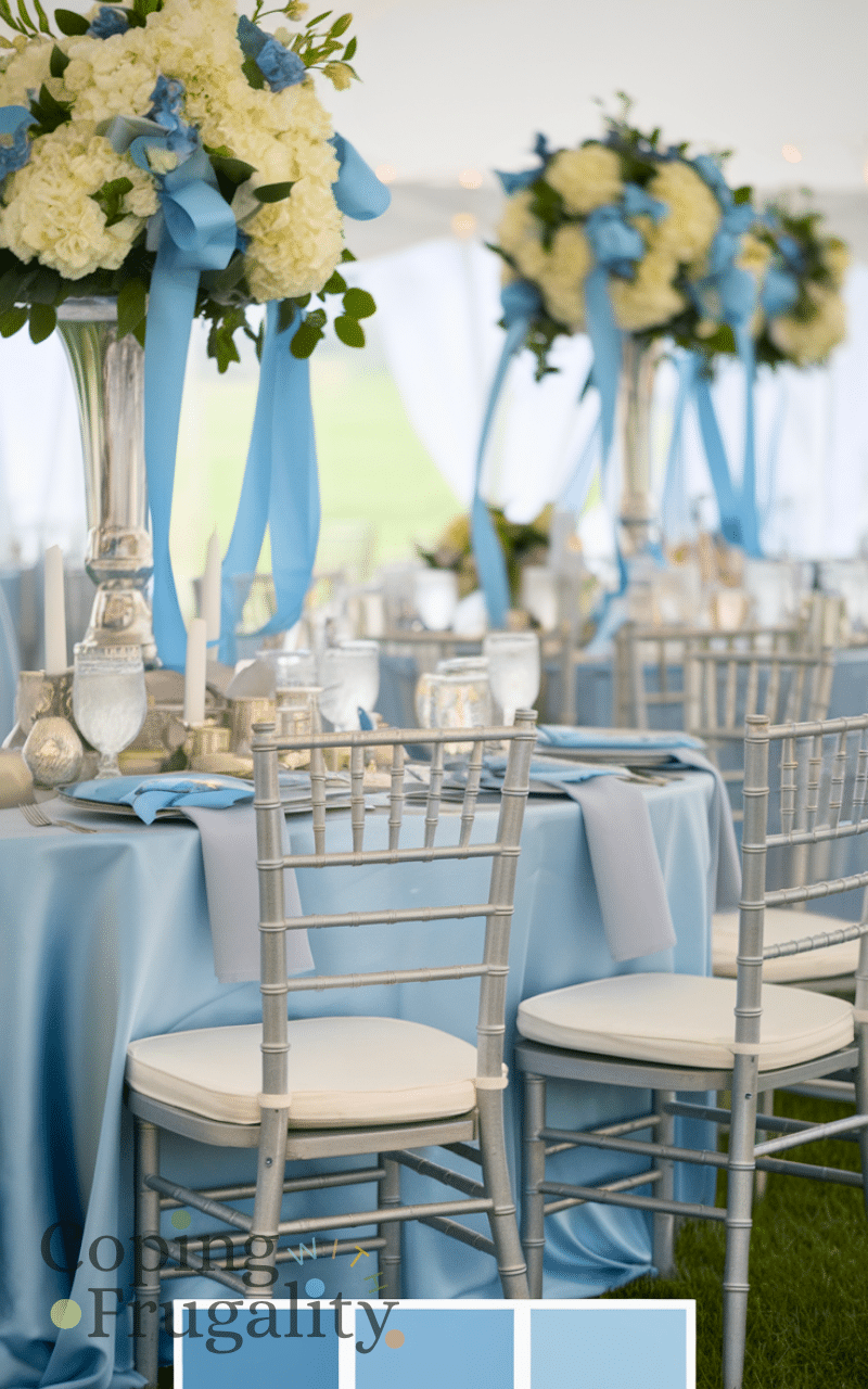 French blue and silver gray make one of the most versatile French Blue Wedding Color Palettes on a Budget because the cool tones create a clean modern and elegant atmosphere without requiring expensive décor and this palette is ideal for couples who love minimalistic style and want their wedding to look effortlessly polished and you can use simple silver candle holders gray linens and French blue florals or ribbons for a striking design that still feels soft and romantic and the colors blend beautifully with natural light which adds brightness without additional cost and this combination works well for indoor and outdoor weddings and if you want French Blue Wedding Color Palettes on a Budget that feel modern and refined this choice will fit your celebration perfectly.