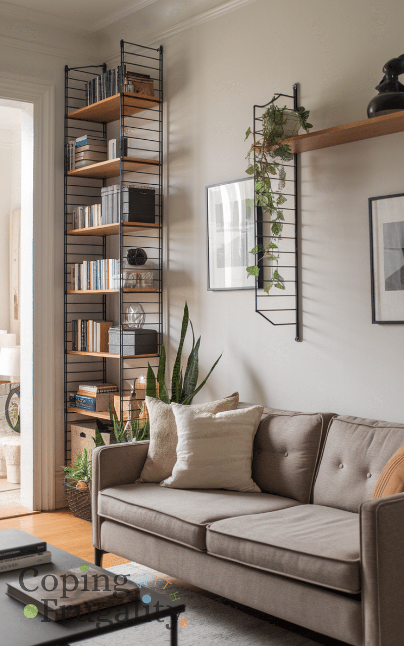 When floor space is limited, vertical storage is key. This Living Room Layout Idea for Small Spaces on a Budget uses wall-mounted shelves or tall bookcases to store items without cluttering the room. Vertical layouts draw the eye upward, making the living room feel taller and more open while staying affordable.