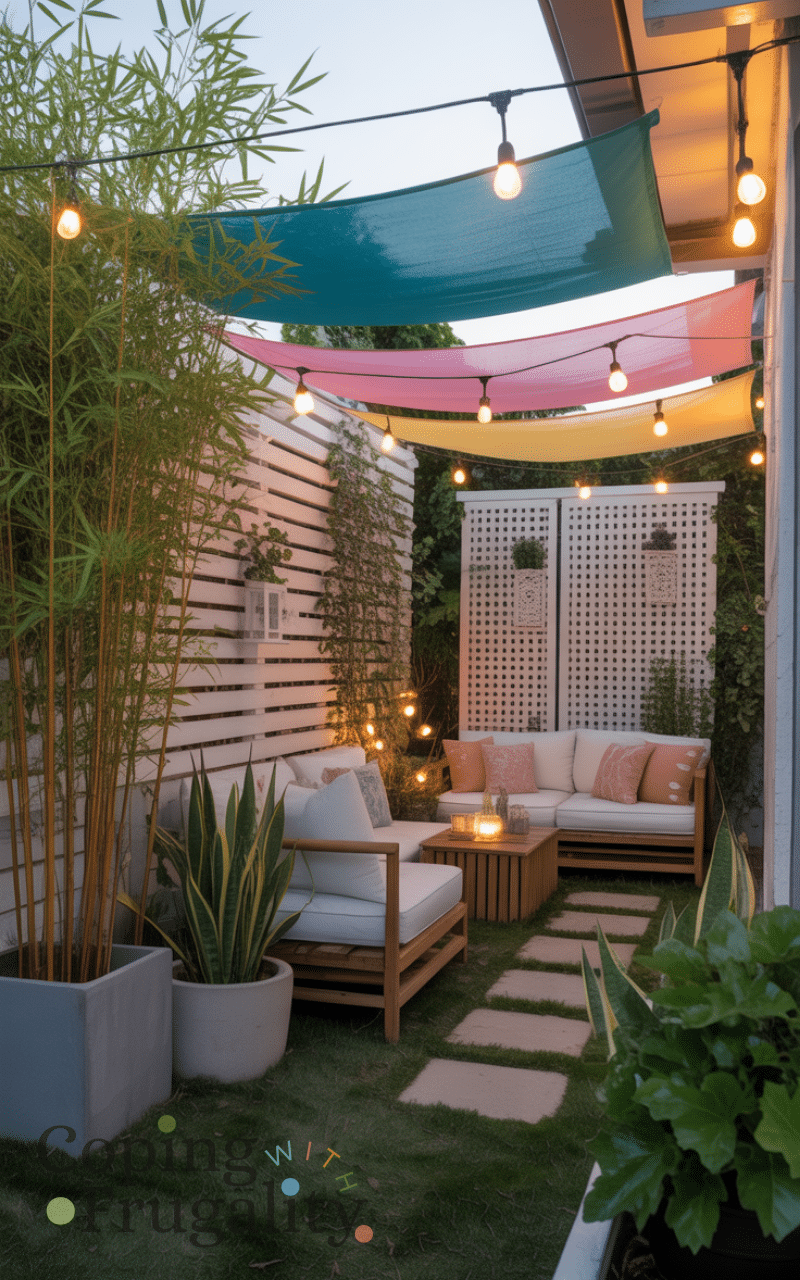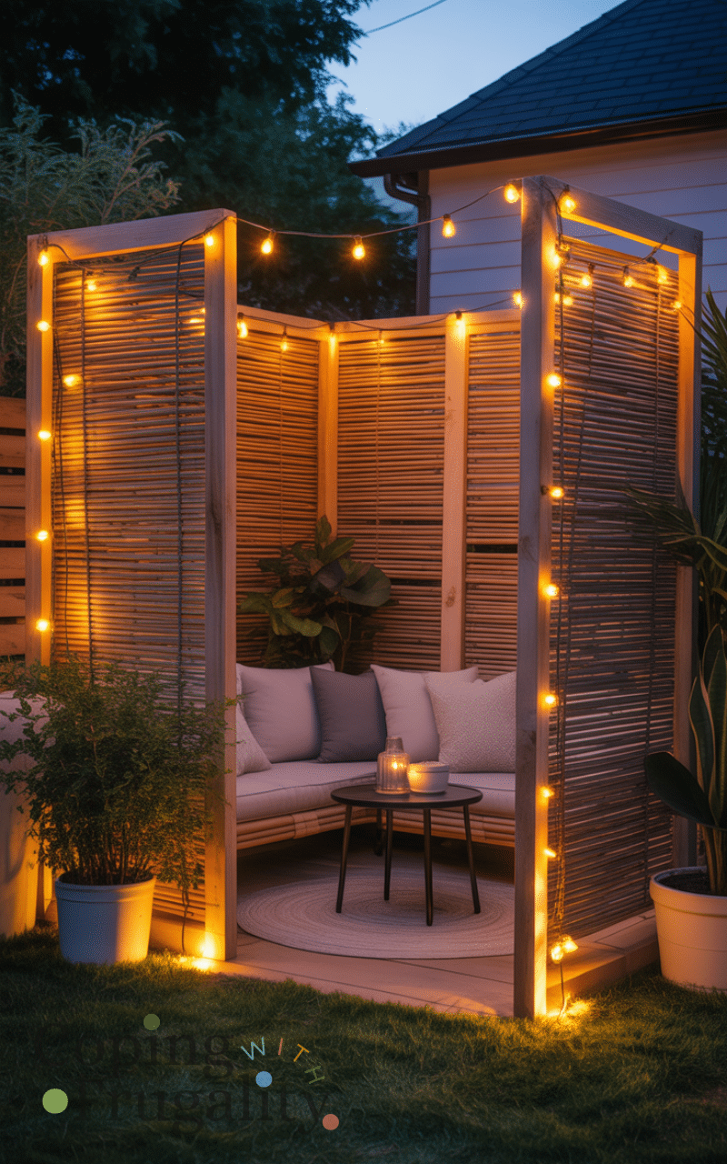 Combining string lights with privacy panels creates cozy small backyard privacy solutions on a budget. The panels block views while the lights add warmth and ambiance. This setup is perfect for evening relaxation and entertaining, making your backyard feel intimate without expensive upgrades.