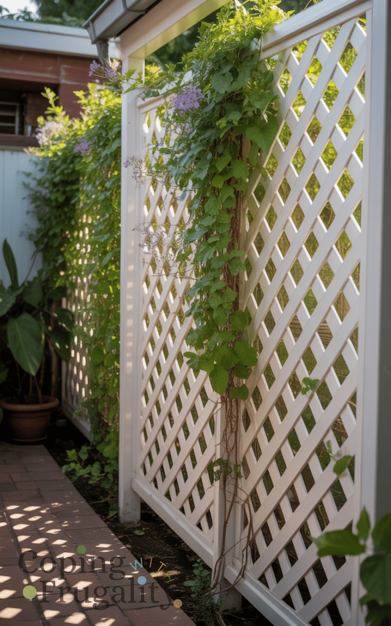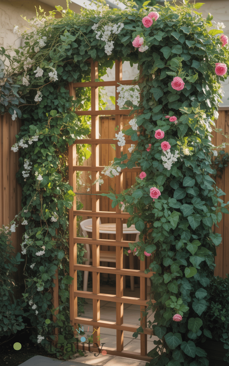 A trellis with climbing plants is a beautiful small backyard privacy solution on a budget. Plants like ivy, jasmine, or climbing roses create a natural privacy wall over time. Trellises are inexpensive, and plants grow fuller each season, making this a long-term, low-cost solution that improves with age.