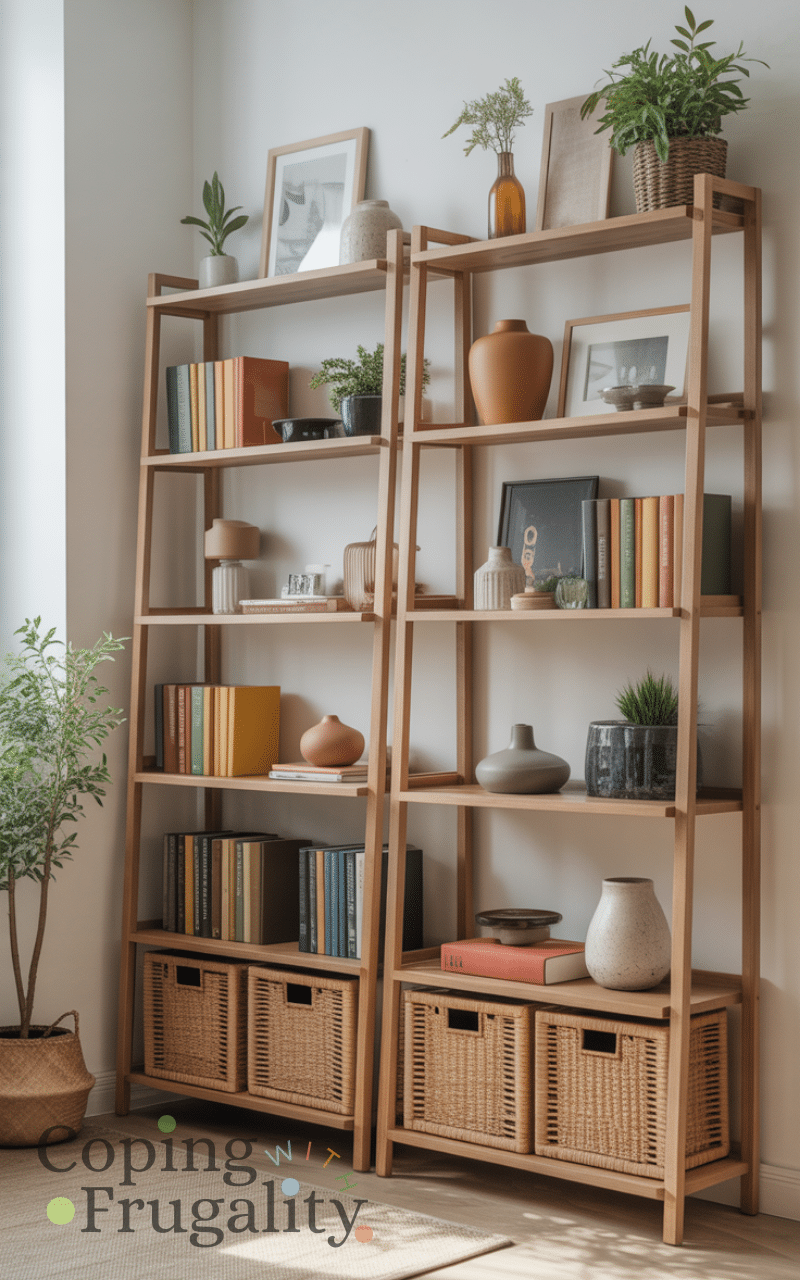 Instead of drilling shelves, use freestanding shelving units. This approach works perfectly with Temporary Home Decor for Renters on a Budget since shelves add storage and style without wall damage. You can decorate them with books, baskets, and décor items, creating both function and personality.