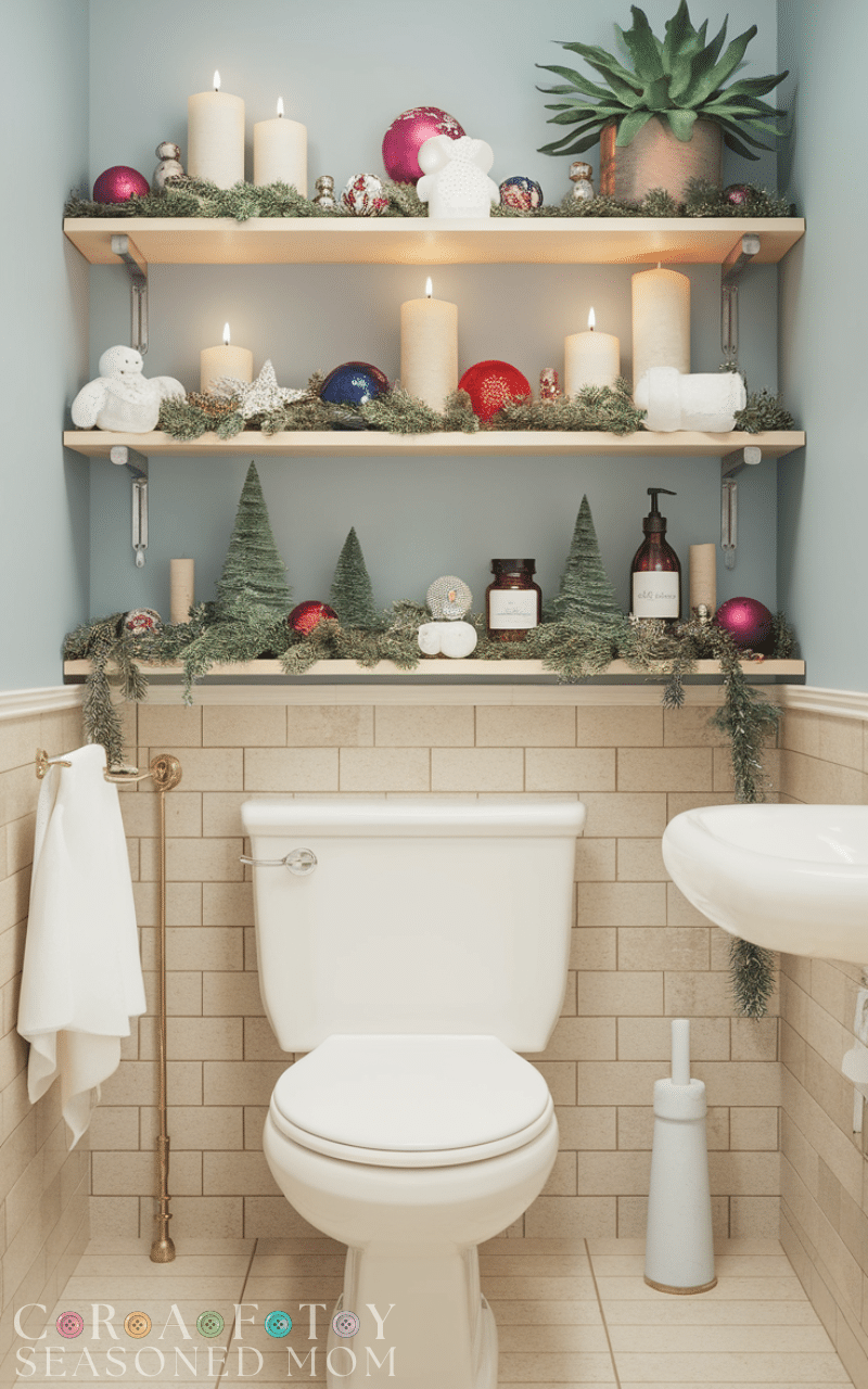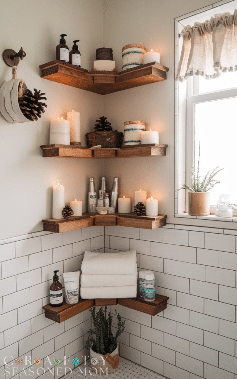 Corner shelves take advantage of overlooked spaces. This winter bathroom storage hack on a budget provides multiple levels for toiletries, candles, or decorative winter items. It keeps the bathroom functional while enhancing visual appeal.