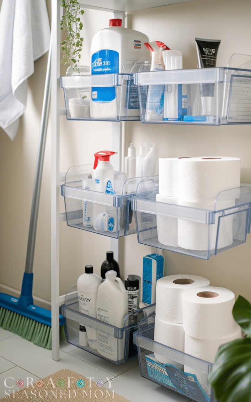 Stackable bins maximize under-sink space, perfect for winter bathroom storage on a budget. Use them to separate cleaning products, extra toilet paper, or bath essentials. Clear bins help you find items quickly and keep everything neat and accessible.