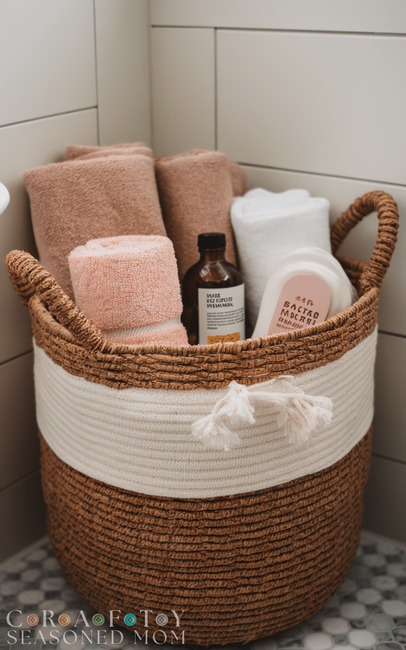 Baskets are both practical and decorative. This winter bathroom storage hack on a budget helps you group extra towels, bath salts, or seasonal toiletries. Woven or fabric baskets add texture and warmth while keeping clutter hidden.