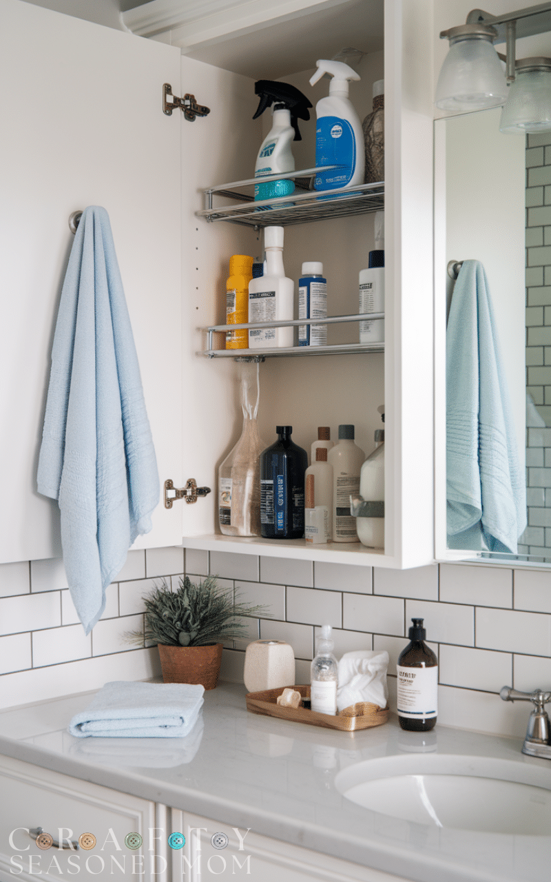 Tension rods are versatile and cheap. This storage hack for winter bathrooms on a budget allows you to hang spray bottles, cleaning supplies, or hand towels inside cabinets. It keeps everything accessible and tidy while freeing up counter space for daily essentials.