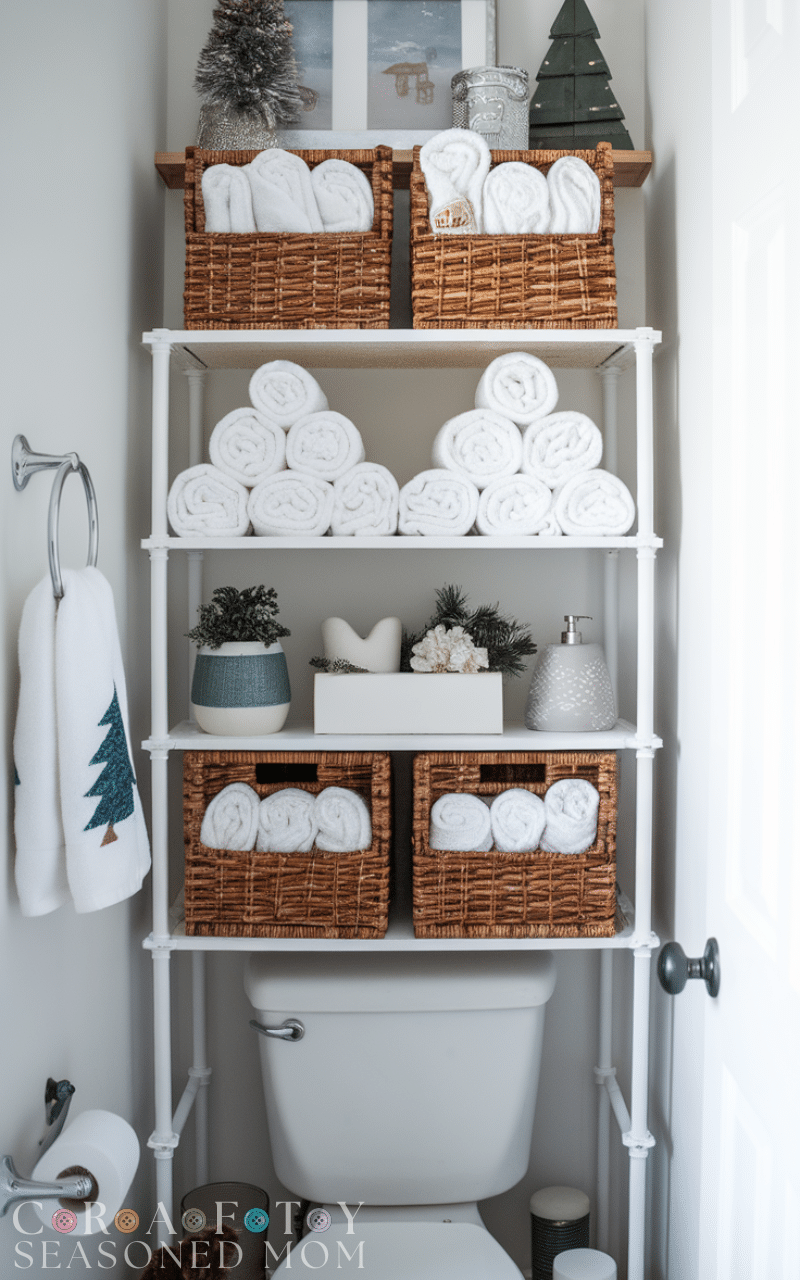 Over-the-toilet shelving is one of the smartest storage hacks for winter bathrooms on a budget. It maximizes vertical space and provides a perfect spot for towels, toiletries, and seasonal essentials like cozy bathrobes. Affordable shelves or DIY units can fit any bathroom, keeping items organized without crowding countertops.