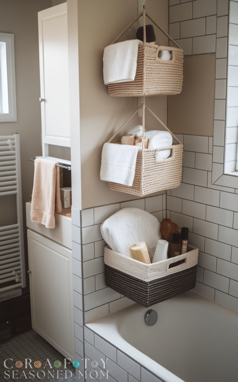 Hanging baskets provide extra storage without taking floor space. This winter bathroom storage hack on a budget works well for hand towels, bath sponges, or lotions. It adds dimension and keeps frequently used items within reach.