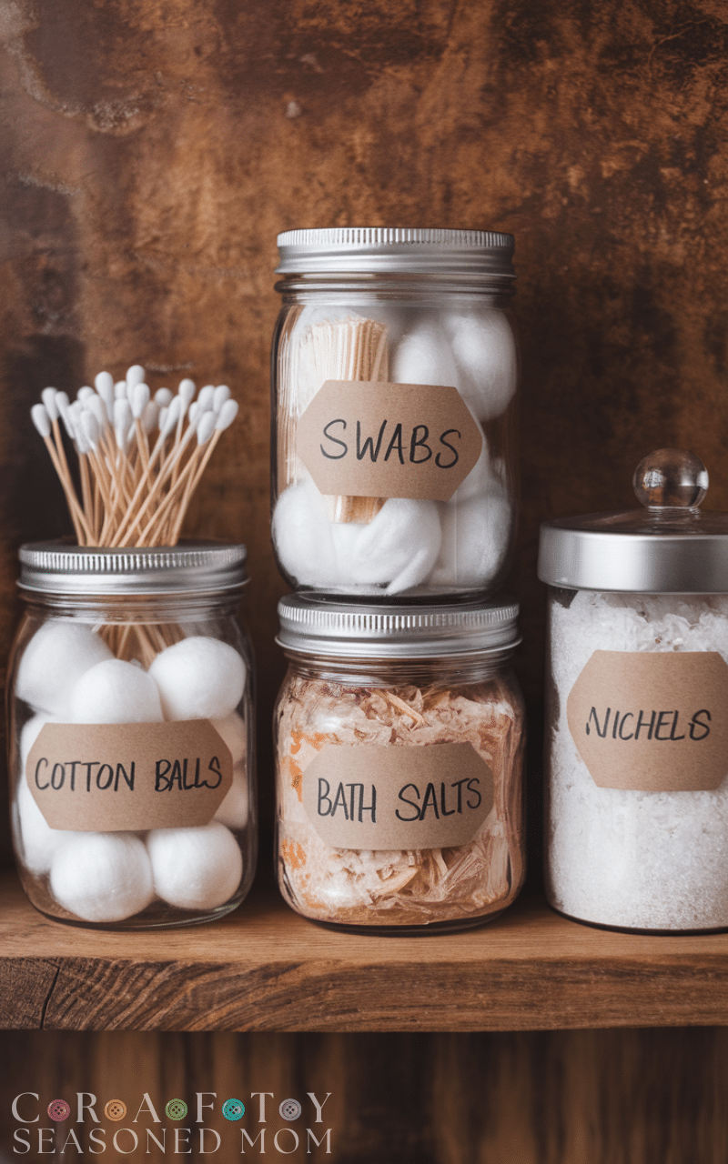 Mason jars or recycled containers are perfect for organizing cotton balls, swabs, and bath salts. This DIY winter bathroom storage hack on a budget adds charm while keeping small essentials neat and accessible. Label them for a polished look.