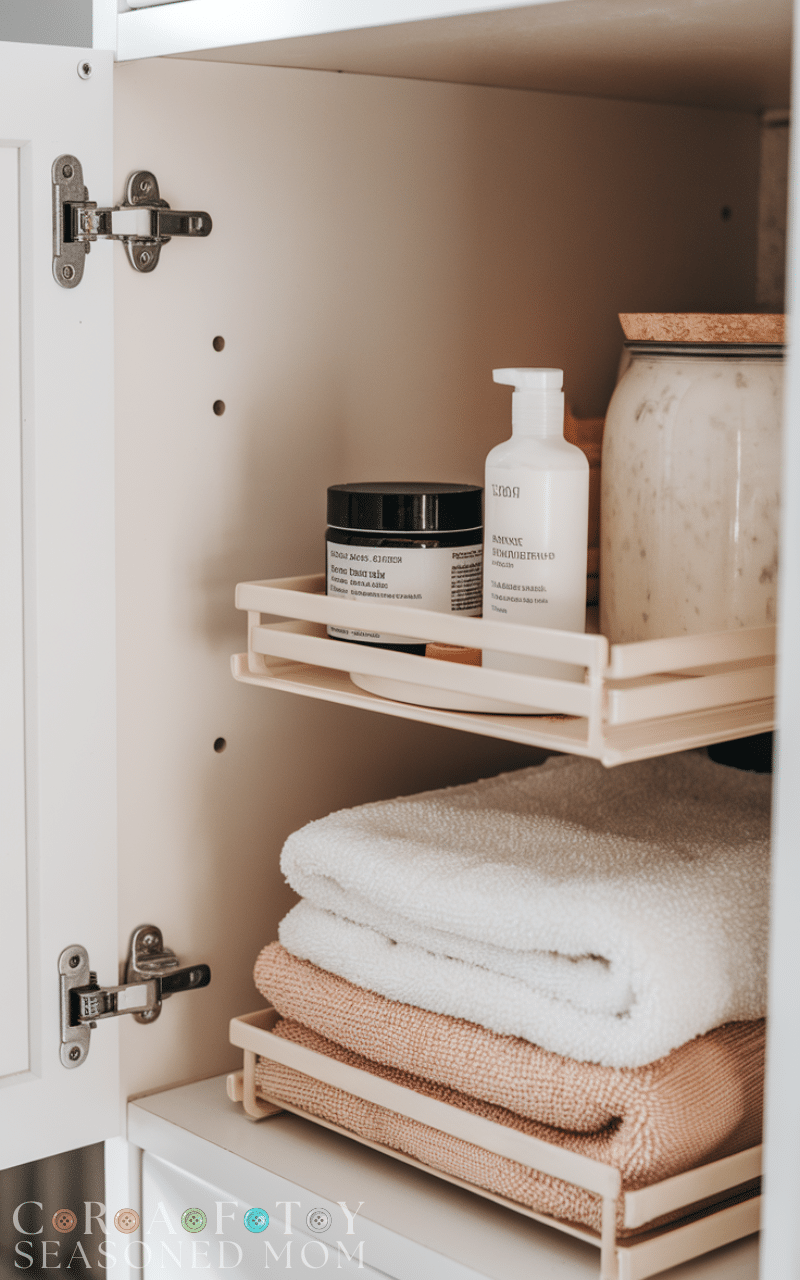 Shelf risers double storage space in cabinets. This winter bathroom storage hack on a budget creates separate layers for towels, jars, or skincare products, keeping items visible and organized while maximizing vertical space.