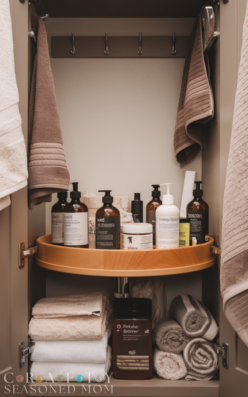 Lazy Susans make deep cabinets more functional. This storage hack for winter bathrooms on a budget allows you to rotate items like lotions, soaps, or extra bath products, making everything easy to grab without digging through clutter.