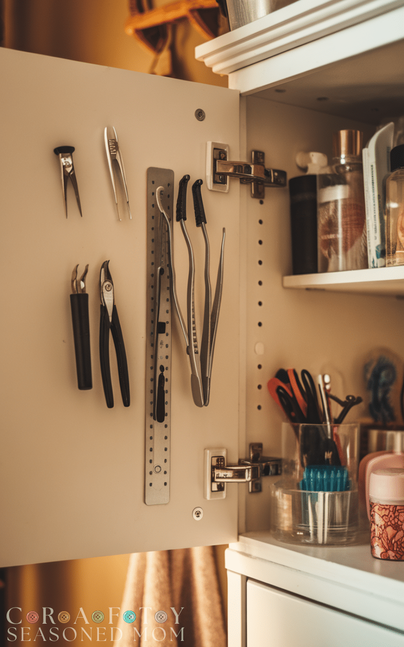 Install a magnetic strip inside a cabinet or on the wall to hold nail clippers, tweezers, and bobby pins. This winter bathroom storage hack on a budget is simple, cheap, and keeps small essentials organized and easy to access.