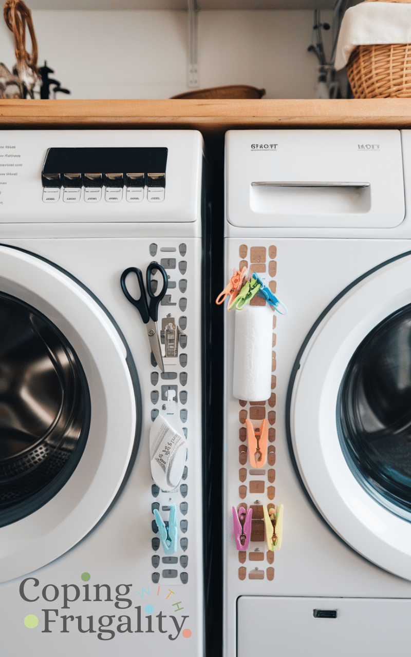 Magnetic strips or adhesive hooks can stick to the sides of your washer and dryer, providing space for small items like scissors, lint rollers, or clothespins. This trick keeps counters free and utilizes otherwise wasted surfaces. Adding magnetic or adhesive storage is a clever way to do a compact laundry area makeover on a budget, making even the tiniest spaces efficient while avoiding expensive built-in solutions.