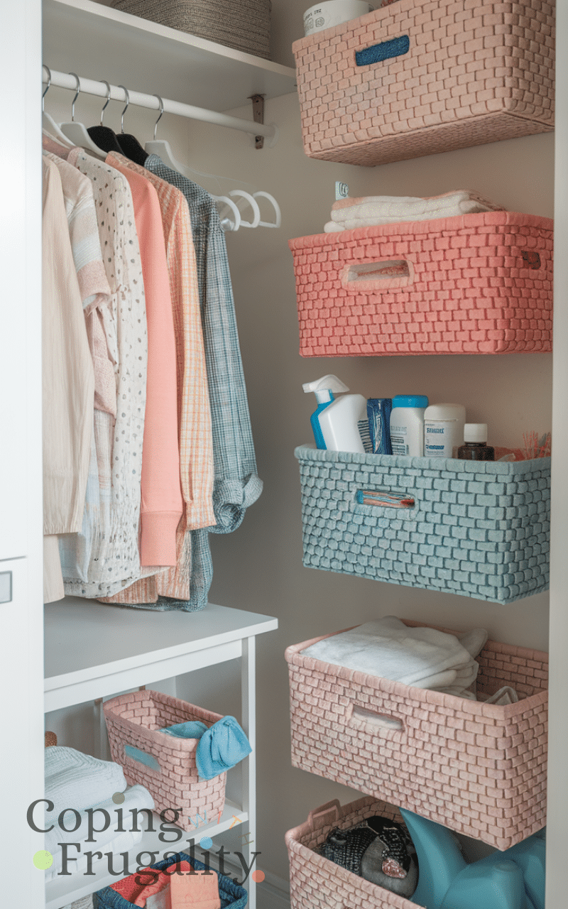 Use matching or colorful baskets to corral laundry supplies, sorting clothes, or holding cleaning products. Grouping items visually reduces clutter and adds a playful pop of color. This strategy is cheap, versatile, and easily updated each season. For a compact laundry area makeover on a budget, baskets and bins keep the space organized and stylish, proving that small touches can have a big impact on functionality and design.