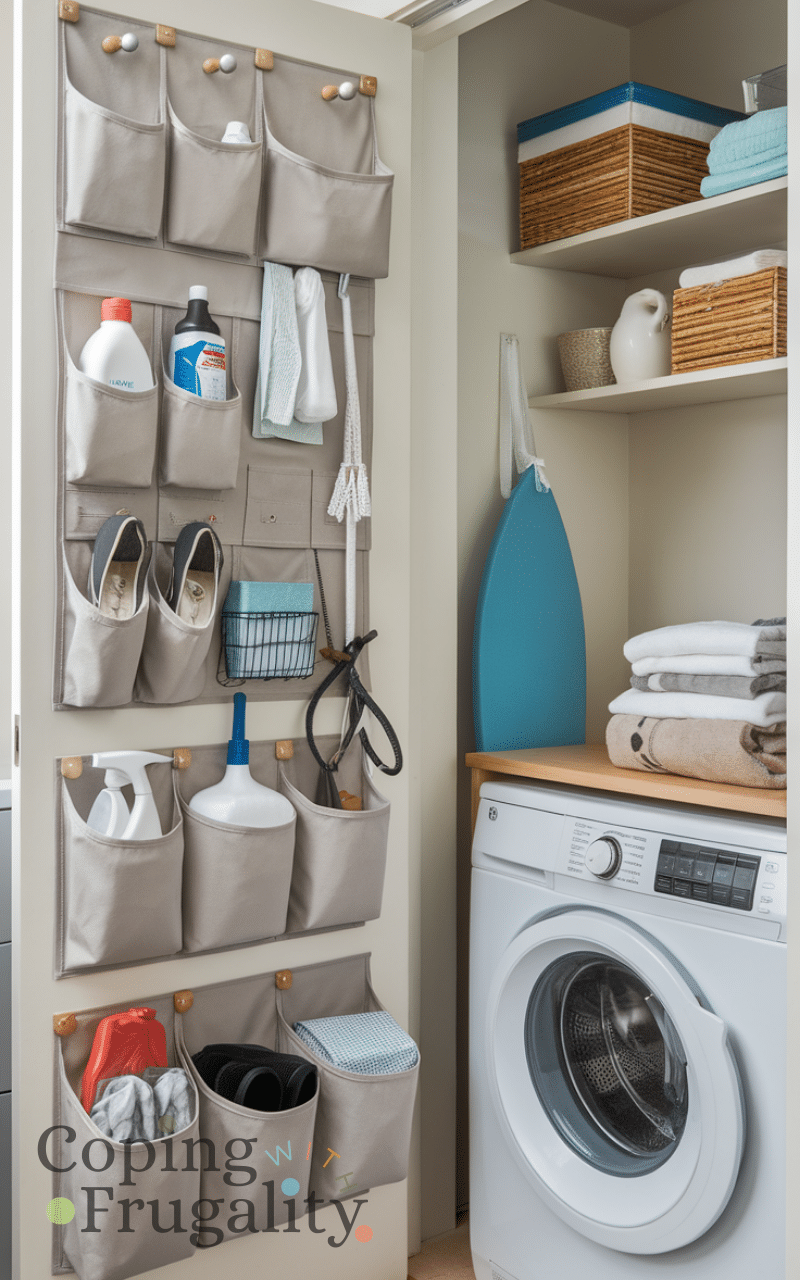 Over-the-door organizers are lifesavers in small laundry areas. They provide pockets or hooks for storing cleaning supplies, ironing tools, or even shoes and small laundry items. Installing one requires no major investment and instantly frees up shelf and counter space. This technique works perfectly for a compact laundry area makeover on a budget, helping you keep items off counters while making sure everything you need is right at hand.