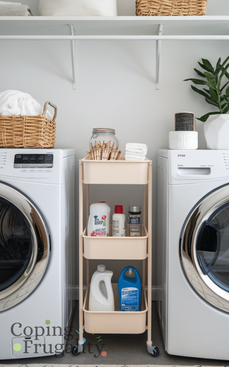 A slim rolling cart can slide between your washer and dryer or sit in a corner, providing extra storage without taking up permanent space. Use it to hold laundry essentials like stain removers, dryer sheets, or spare clothespins. Rolling carts are inexpensive, easy to move, and perfect for a compact laundry area makeover on a budget. With a few decorative baskets or jars on top, your cart can double as a stylish addition, keeping your laundry zone organized and accessible.