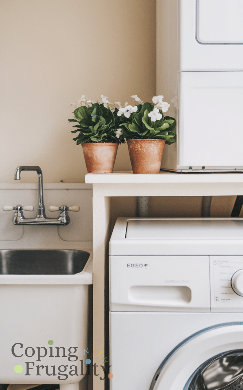 Add small potted plants or faux greenery to bring life and freshness to your laundry area. Plants can improve mood and make the space feel inviting. Including greenery in your compact laundry area makeover on a budget is a subtle, cost-effective way to make the space feel more vibrant and enjoyable.