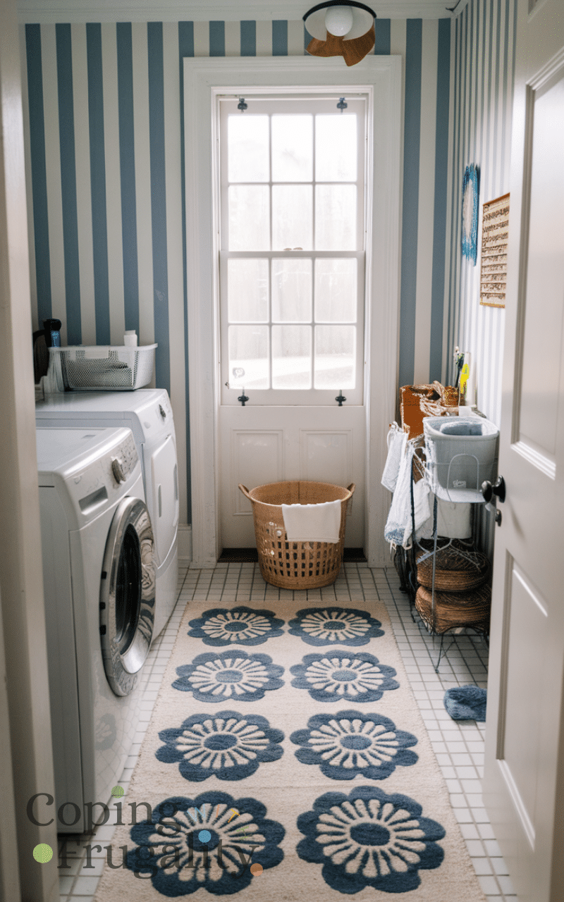 A small, washable rug adds warmth and comfort underfoot while enhancing the decor. Choose a patterned or bright-colored mat to make the space feel cheerful. For a compact laundry area makeover on a budget, rugs are an easy way to add style and comfort without taking up space or requiring major changes.