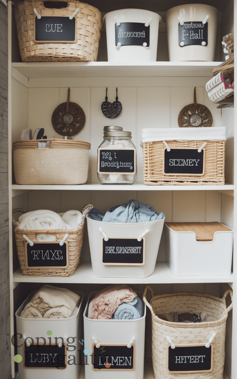 Labeling baskets, jars, and containers makes it easier to find what you need while adding charm to the space. Use fun fonts, colors, or even chalkboard labels to personalize your compact laundry area. Decorative labels are inexpensive and make a compact laundry area makeover on a budget feel intentional and thoughtfully designed while helping you stay organized.