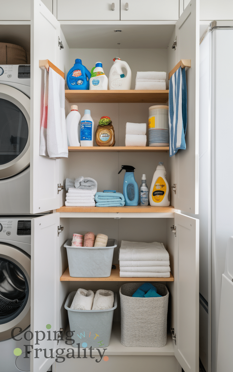 A narrow cabinet can fit into tight corners and provide vertical storage for laundry detergents, cleaning supplies, or towels. Choose one with adjustable shelves to customize space for larger items. Incorporating a slim storage cabinet in your compact laundry area makeover on a budget is an easy way to hide clutter and maintain a clean, streamlined look without spending a fortune.