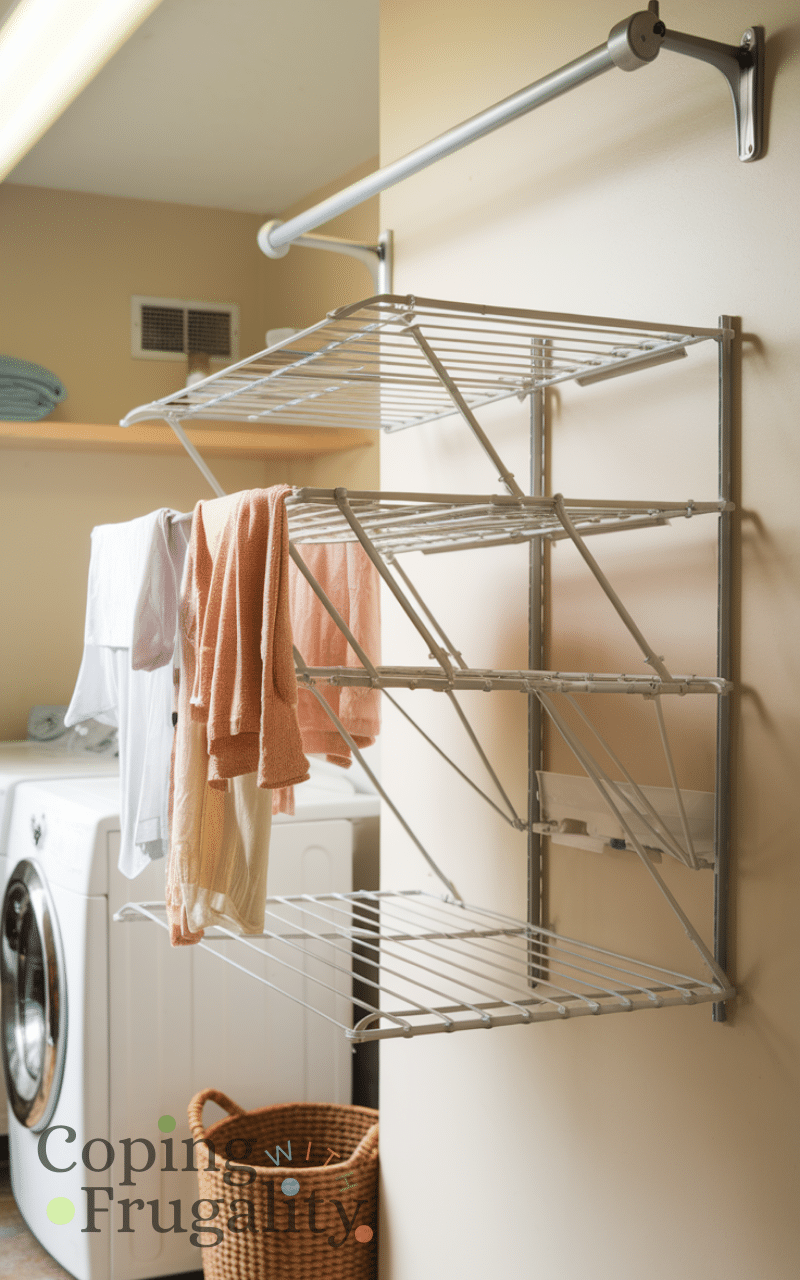 A foldable wall-mounted drying rack allows you to air-dry clothes without taking up floor space. You can fold it down when needed and tuck it away when not in use. This is perfect for apartments or homes with limited laundry space. Including a drying rack in your compact laundry area makeover on a budget maximizes utility while keeping the area uncluttered and functional.