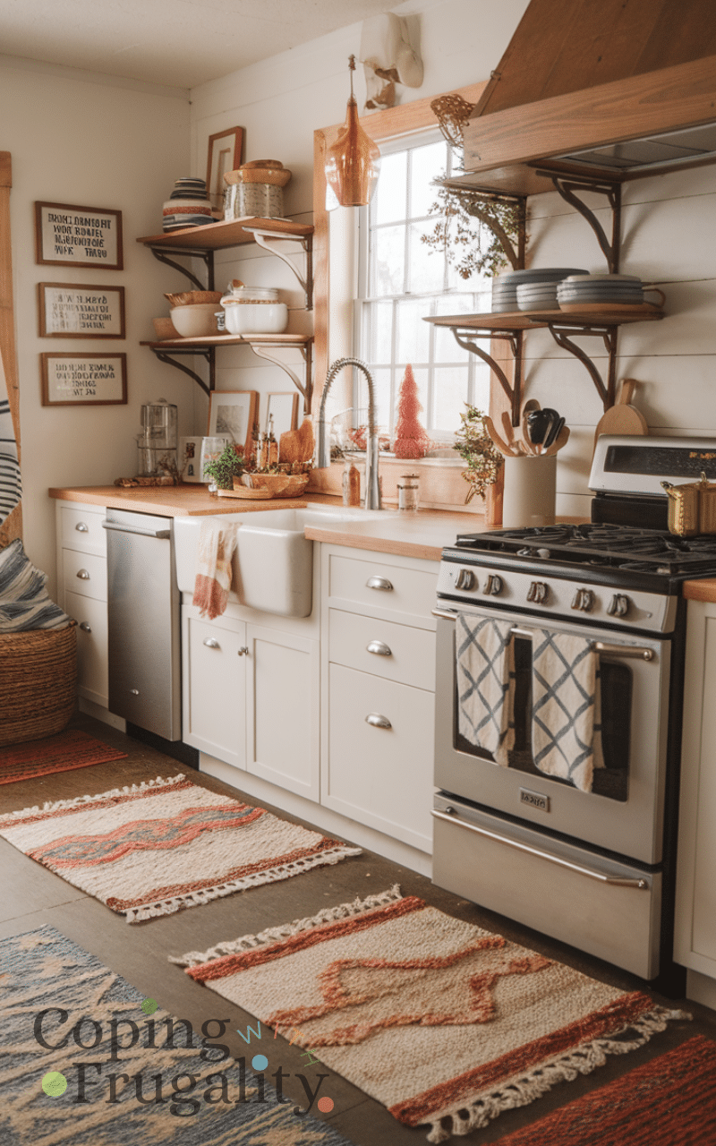 Placing small, layered rugs in front of the sink or stove area adds warmth and comfort underfoot. Cozy winter kitchen styling on a budget can benefit from affordable, washable rugs that also introduce texture and color. Layering a few rugs gives the illusion of a custom, designer look without spending much, and it’s practical for keeping floors warm and safe from spills. Choose patterns and textures that complement your existing decor to create a cohesive, inviting space. Rugs not only enhance comfort but also add a cozy, homey touch that makes your kitchen a space you want to spend more time in.