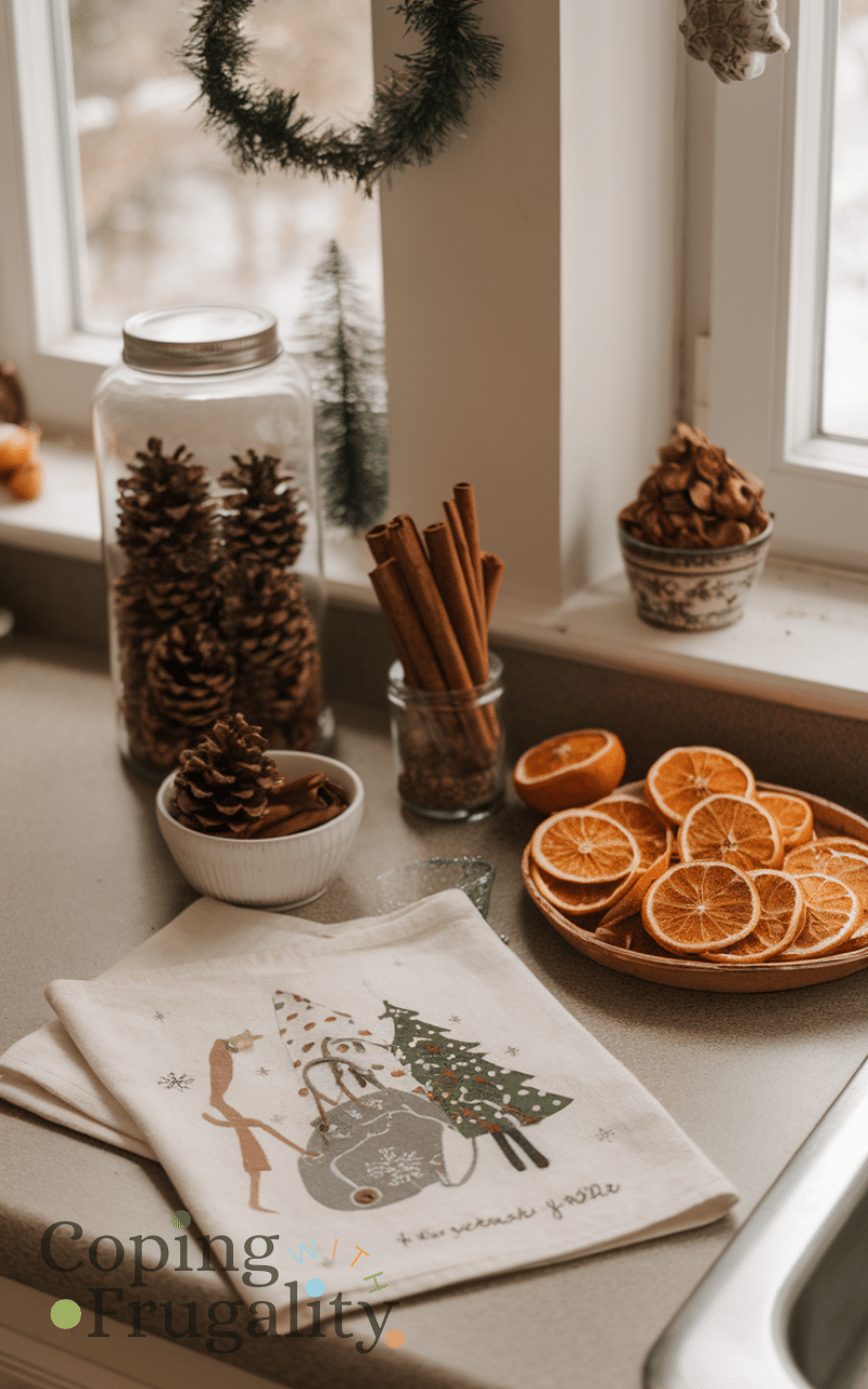 Decorating with seasonal items like pinecones, cinnamon sticks, dried oranges, or small evergreen branches can make your kitchen feel festive and cozy without spending much. For cozy winter kitchen styling on a budget, arrange these natural elements in jars, bowls, or on trays to add charm and seasonal flair. Small touches like a holiday-themed kitchen towel or a simple wreath above a window create warmth and character. These inexpensive, easy-to-change decorations can be swapped throughout the season, making your kitchen feel fresh and inviting while keeping the focus on a snug winter aesthetic.