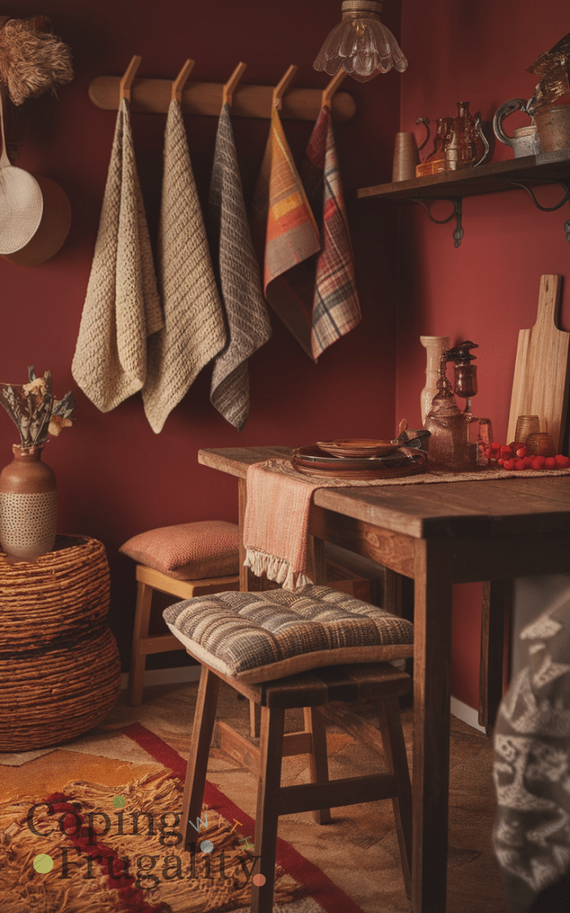 Introducing soft textiles like knitted dish towels, cushioned seat pads, and cozy rugs can instantly transform your kitchen into a warm, inviting space. For cozy winter kitchen styling on a budget, focus on rich textures and warm colors like deep reds, oranges, or earthy browns. These affordable additions not only make your kitchen feel snug but also add layers of charm and comfort. You can even repurpose old blankets as chair covers or table runners. Small textile changes make a huge difference in creating that cozy, lived-in feeling that makes cooking and dining more enjoyable during chilly winter days.