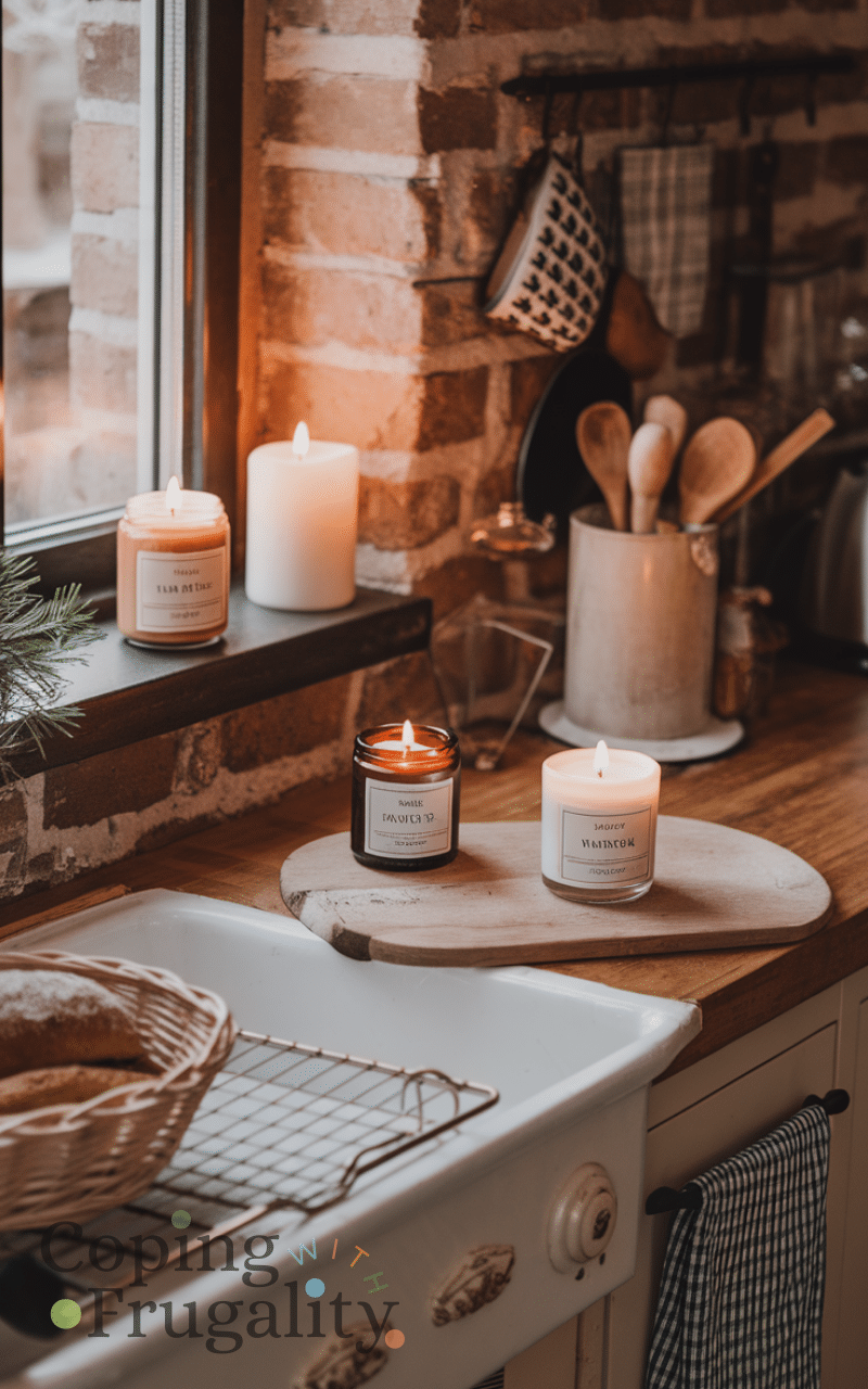 Scented candles with winter fragrances like cinnamon, pine, or vanilla enhance the cozy feel. Cozy winter kitchen styling on a budget is achievable with a few strategically placed candles, which create both warmth and aroma. Use candle clusters on counters or windowsills to set a relaxing atmosphere during cooking or dining. The combination of soft flickering light and seasonal scents makes the kitchen feel intimate, inviting, and comforting. Candles are inexpensive but highly effective in creating a winter retreat right in your home, perfect for enjoying family time or a quiet evening.