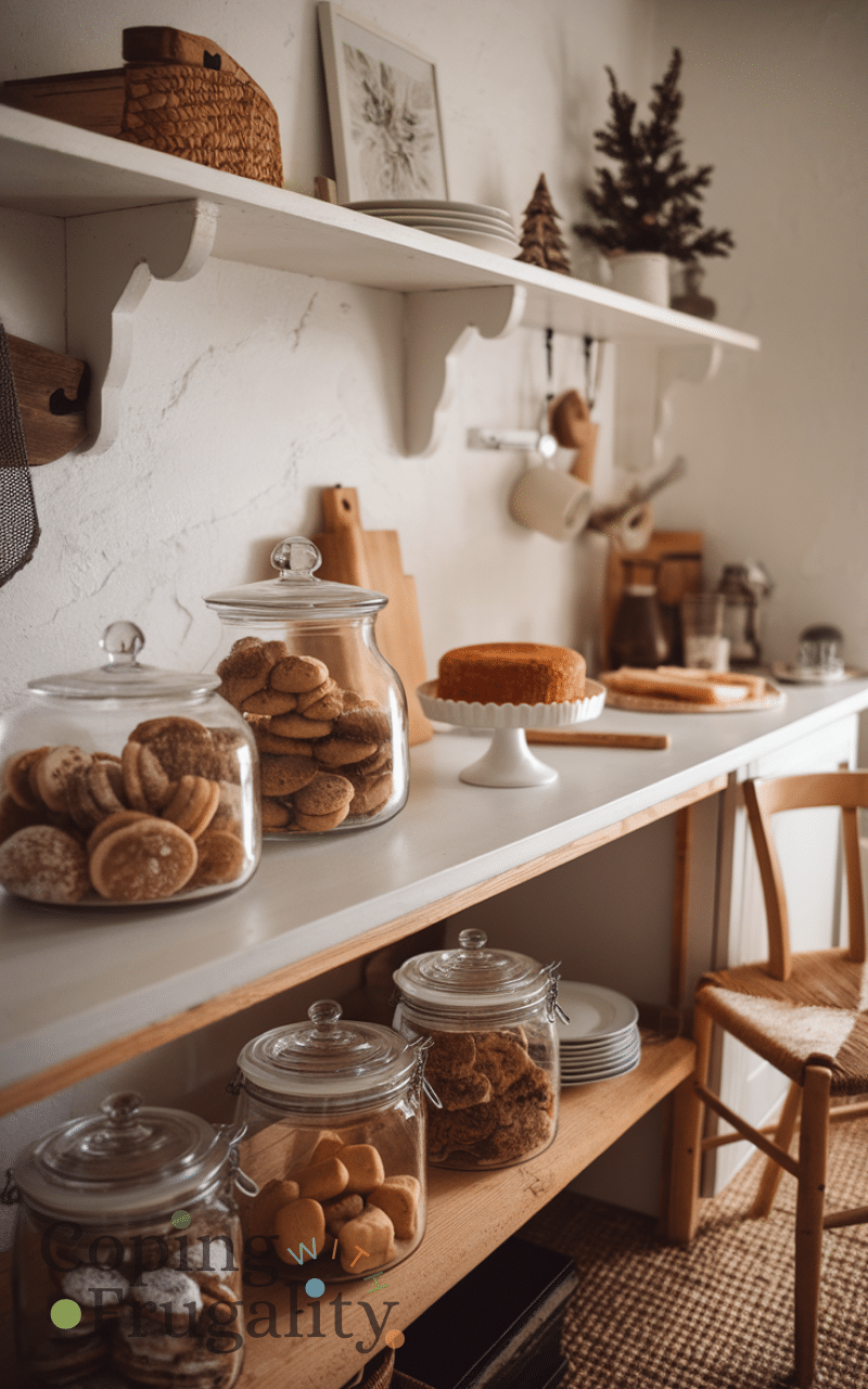 Showcasing cookies, breads, or pastries in clear jars or cake stands instantly makes your kitchen feel inviting. Cozy winter kitchen styling on a budget is enhanced by the sight and smell of homemade goodies, which create warmth and comfort. Even simple treats can transform the atmosphere, making your kitchen a hub of coziness. Arrange baked items on open shelves or counters to combine style and function. This approach adds charm, encourages gatherings, and reflects the heart of a welcoming kitchen without needing expensive decor, reinforcing the cozy winter vibe with personal touches.