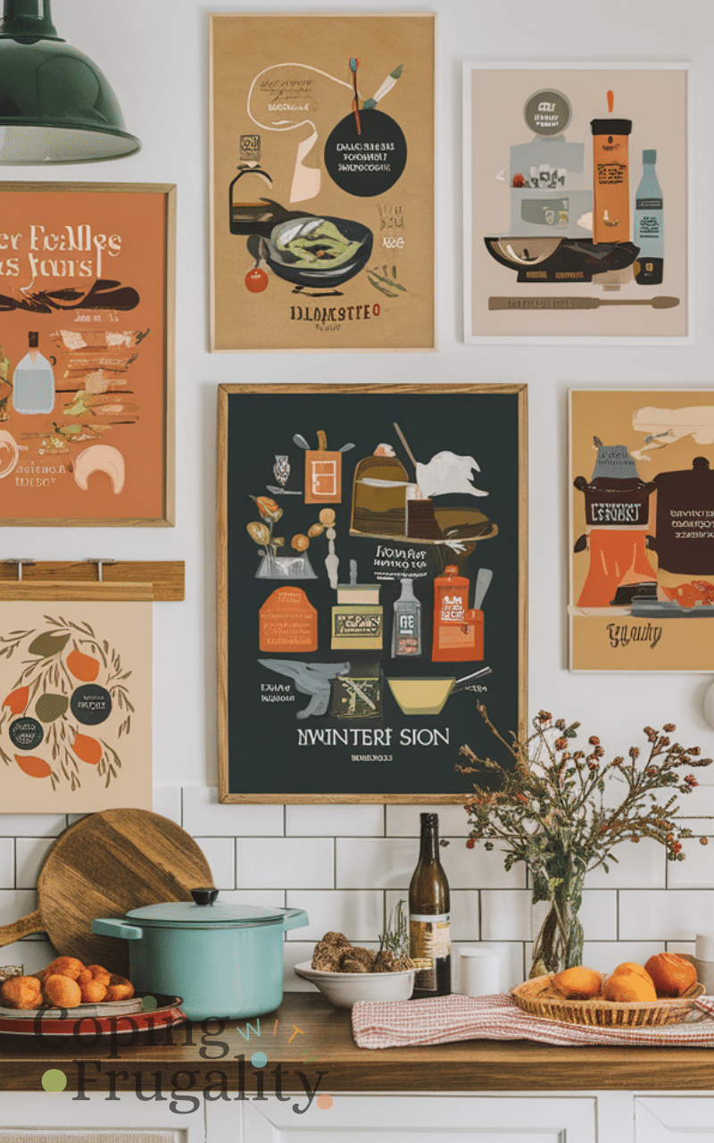 Add inexpensive prints or framed seasonal artwork on the walls to create personality and warmth. Cozy winter kitchen styling on a budget can be achieved by printing art at home or purchasing affordable posters. Choose images with warm colors, food illustrations, or winter scenes to reinforce the cozy vibe. Rotating artwork seasonally keeps the kitchen fresh and engaging. This simple trick elevates the look of your kitchen without breaking the bank and helps create a space where you feel inspired to cook, gather, and enjoy time with family during the winter months.