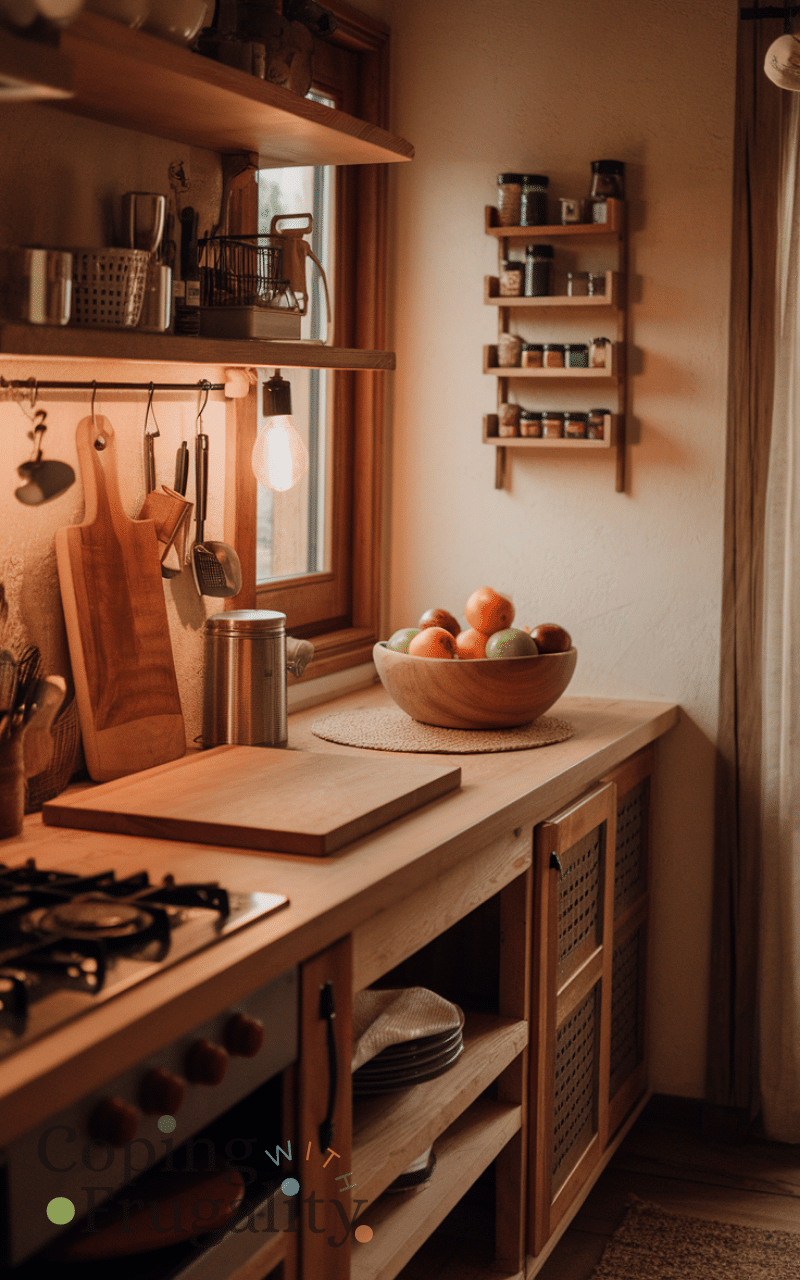 Incorporating wooden cutting boards, shelves, or utensil holders adds natural warmth and texture. Cozy winter kitchen styling on a budget thrives on wooden accents because they instantly soften a space and make it feel welcoming. Look for second-hand or repurposed wood items to keep costs low. Wooden elements pair beautifully with warm textiles and lighting, enhancing the cozy aesthetic. Even small additions like a wooden fruit bowl or spice rack can create a significant visual impact, making your kitchen feel like a charming, rustic retreat during winter months.